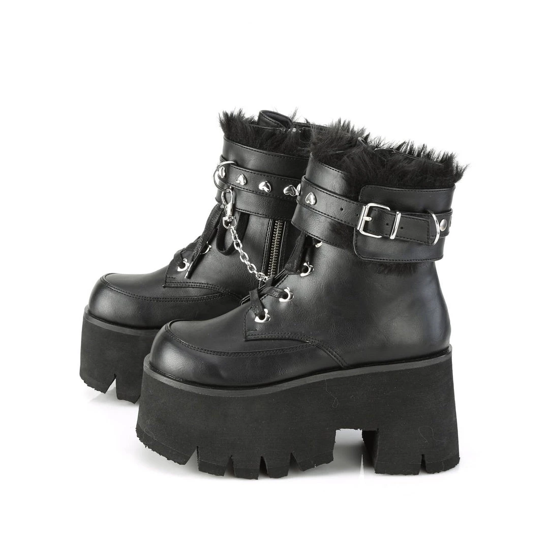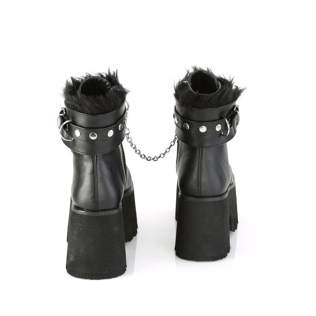 Stomp around in these funky 3 1/2″ (90mm) chunky heel, 2 1/4″ (57mm) cut-out platform heart eyelet lace-up ankle boots featuring fur lined adjustable removeable ankle cuffs with heart studs, D-ring & chain with swivel snap hooks details and metal side zip closure.