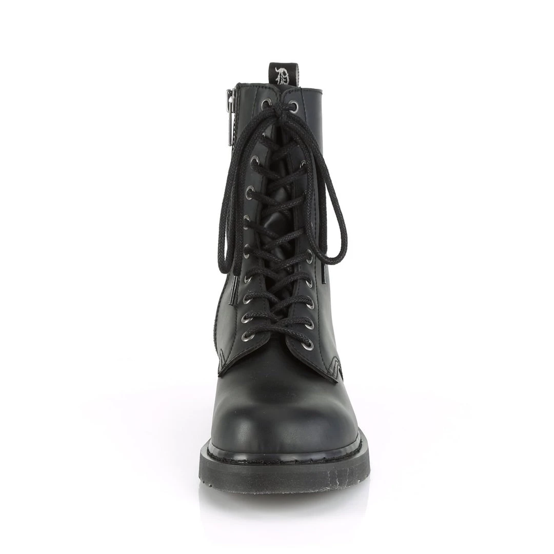 Classic 1 1/4″ (32mm) stacked flat heel 10-eyelet lace-up mid calf unisex vegan boot with back pull-tab and inside zip closure.