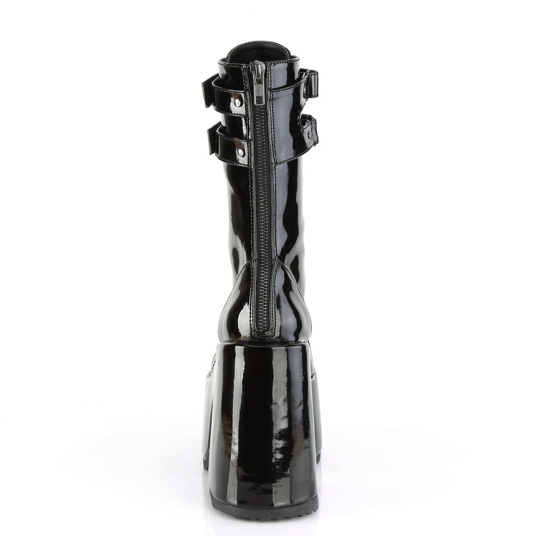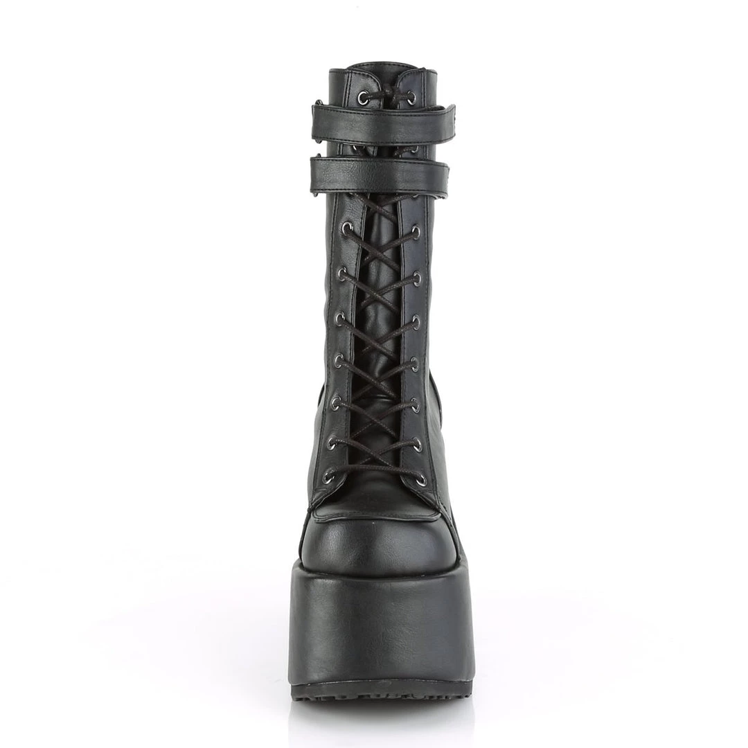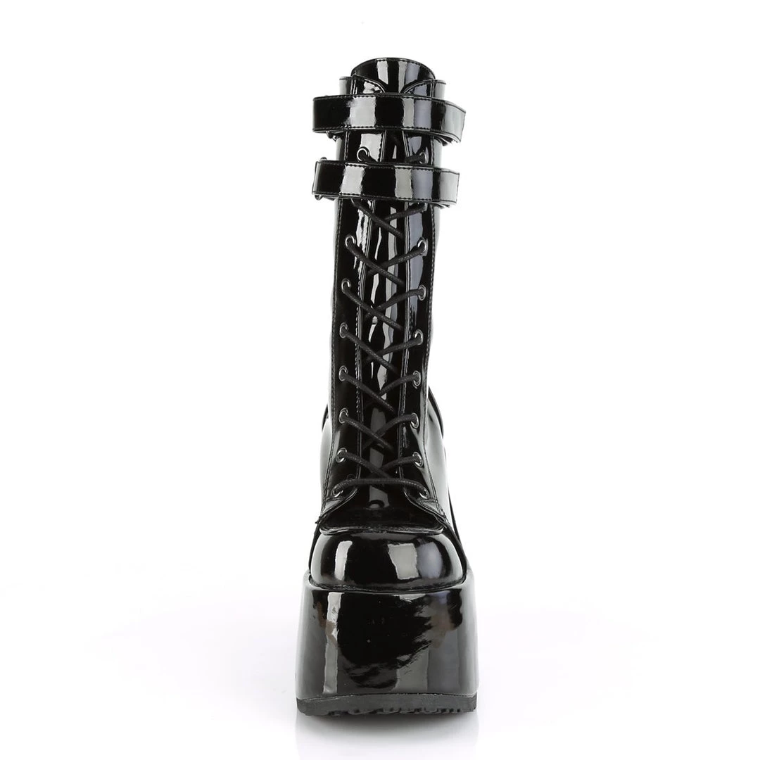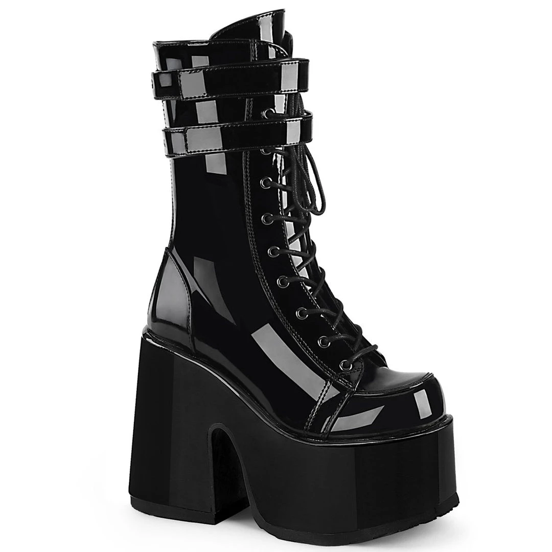 Stand tall in these 5″ (127mm) chunky heel, 3″ (75mm) platform lace-up mid-calf boot featuring double hook N’ loop straps and back zip closure for easy wear and go.