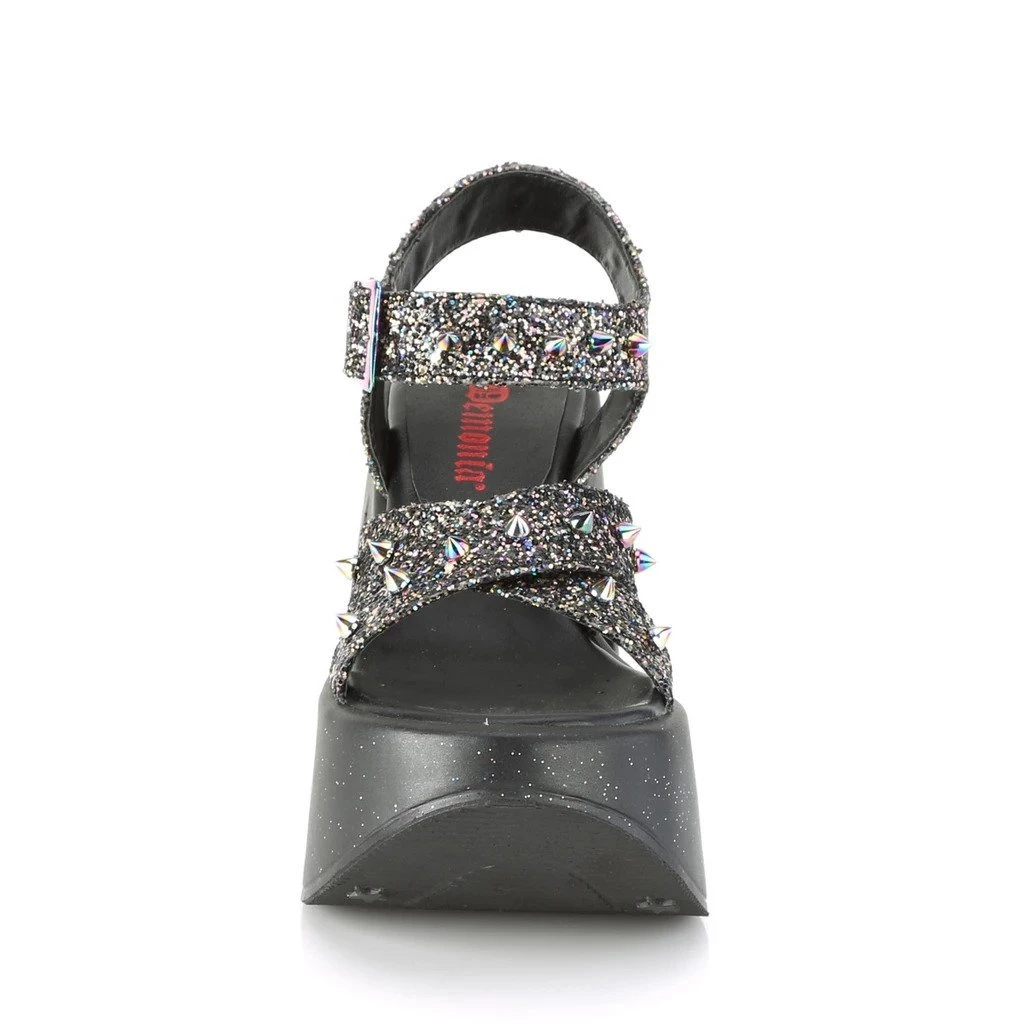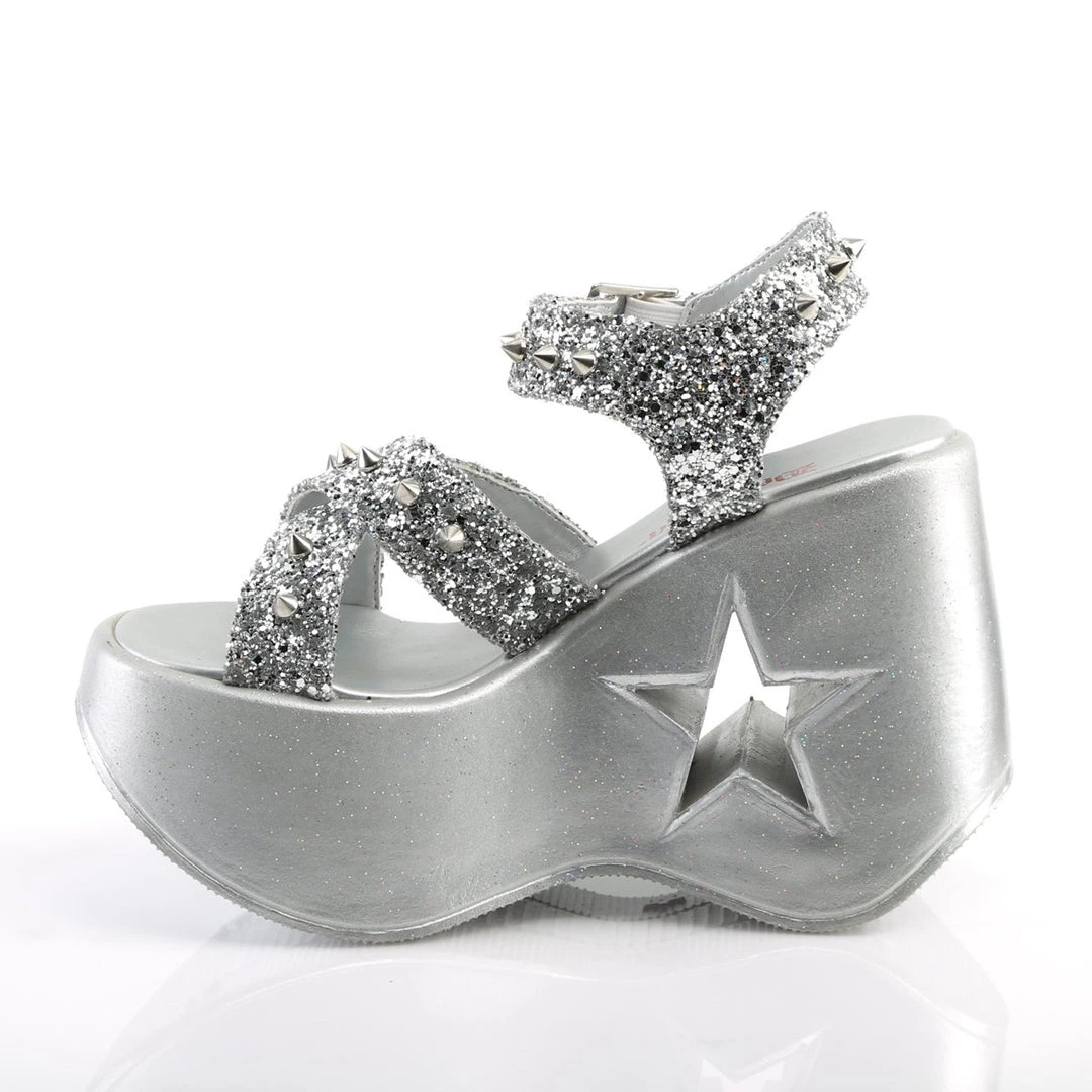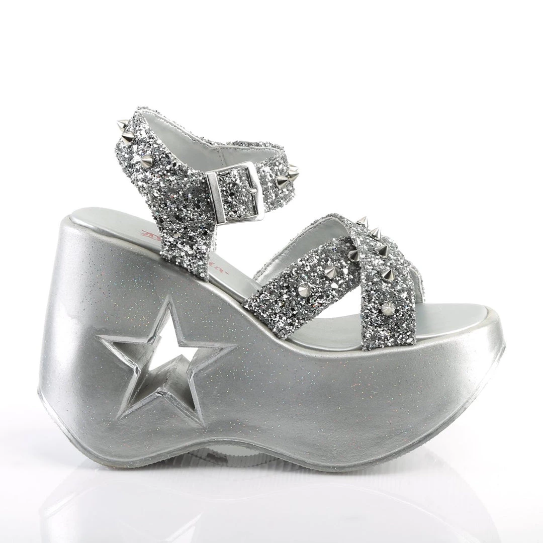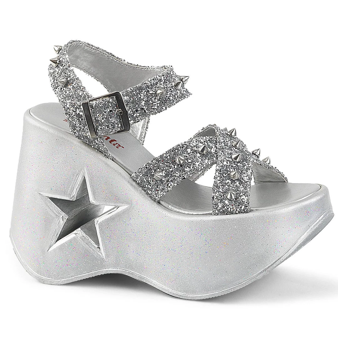 Edgy and fun Demonia 5″ star cutout platform wedge criss cross ankle strap sandal with cone spike detail.
