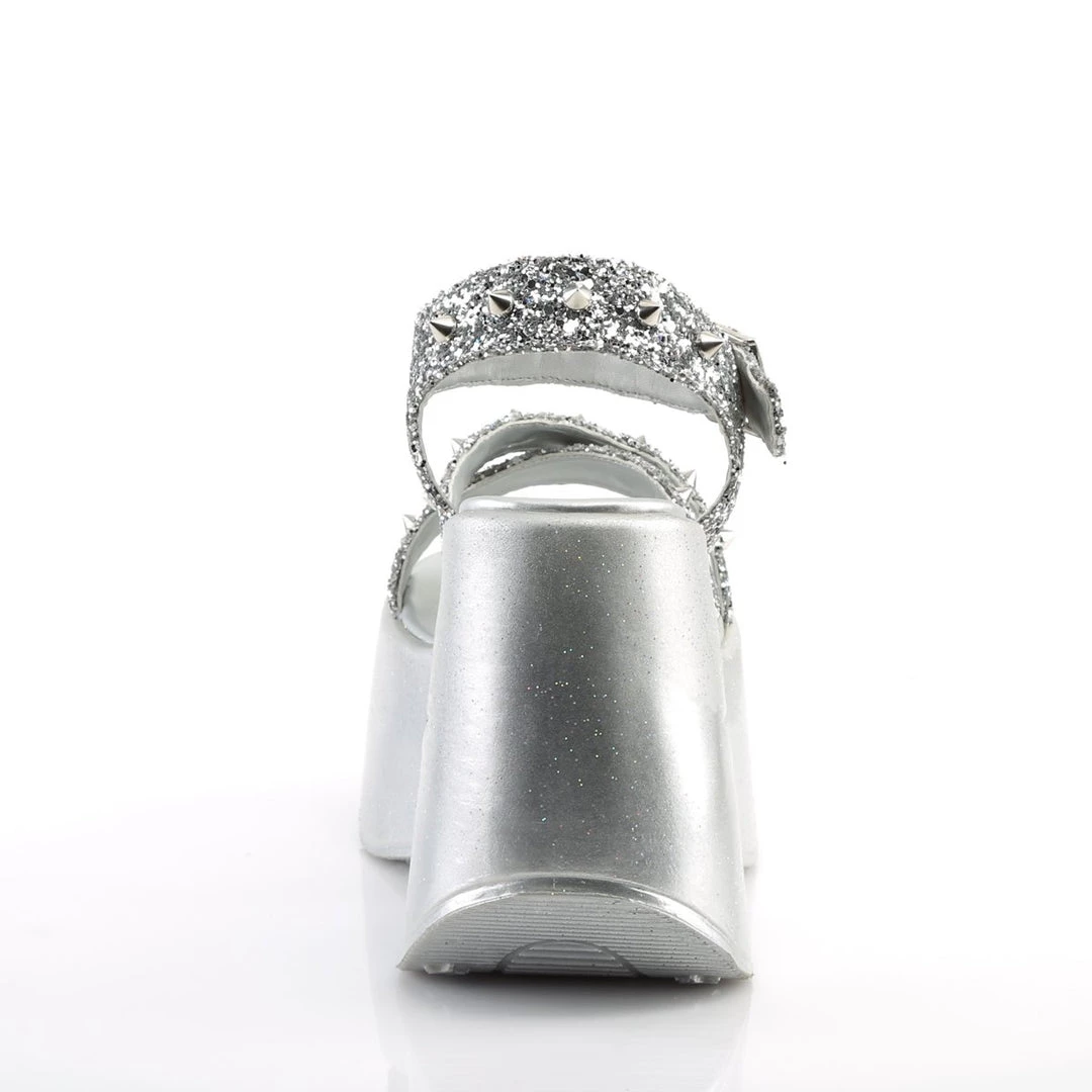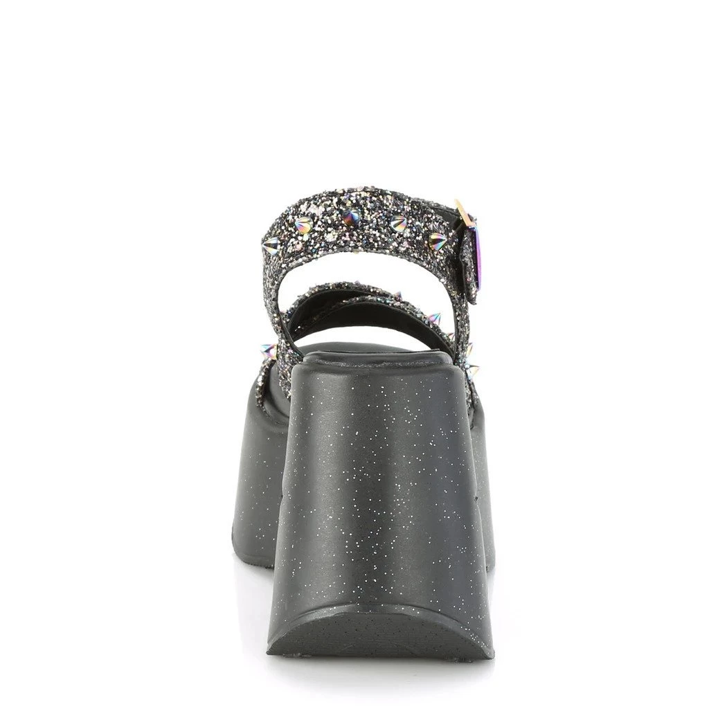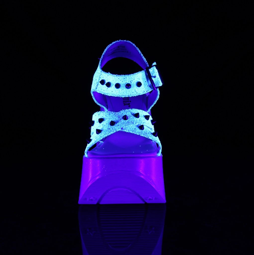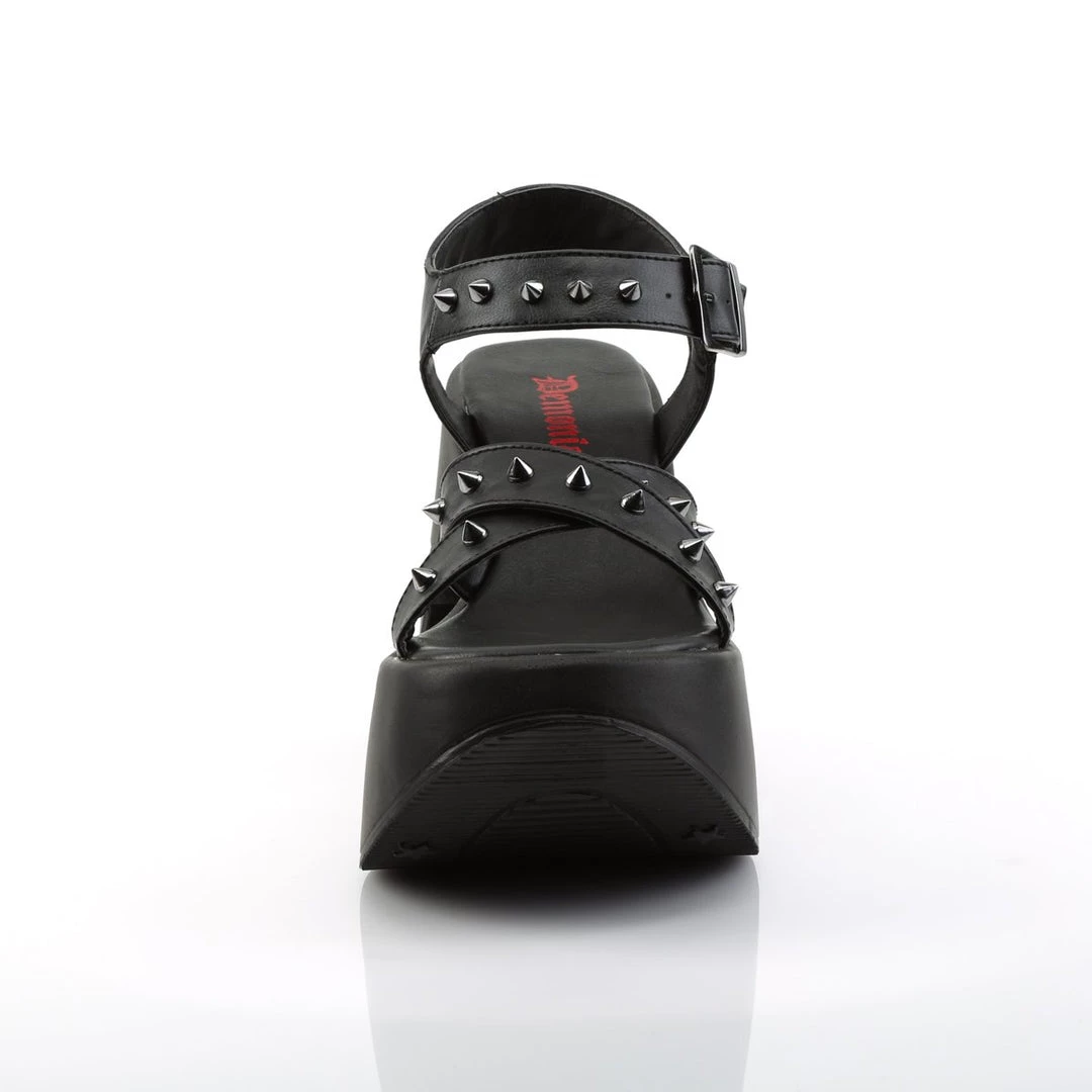 Edgy and fun Demonia 5″ star cutout platform wedge criss cross ankle strap sandal with cone spike detail.