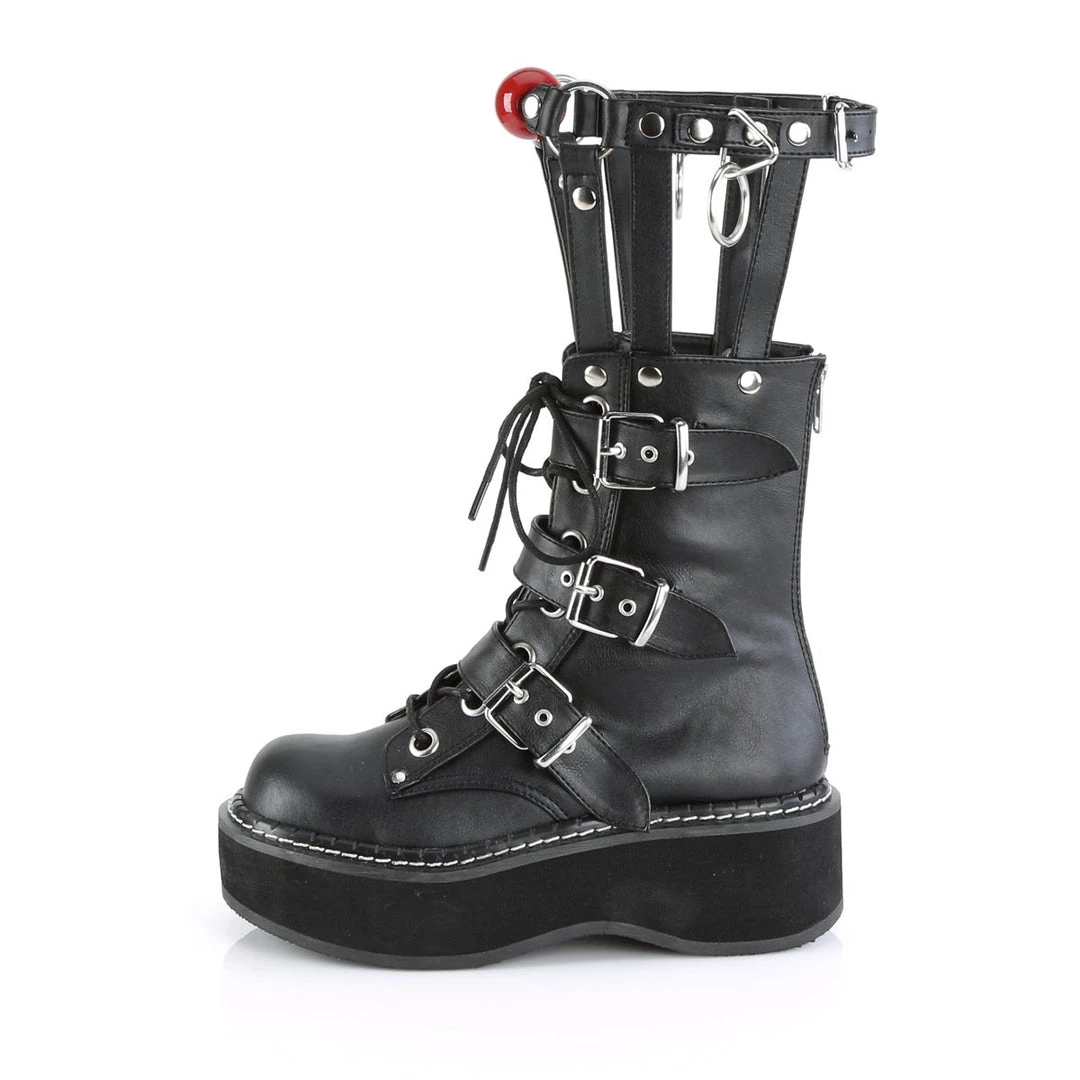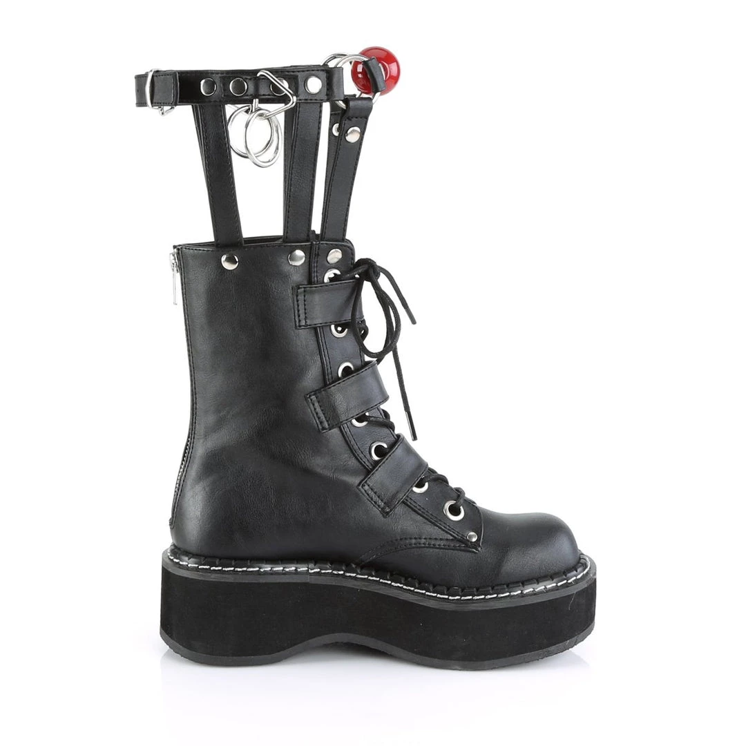 Unique 2″ (51mm) platform lace-up buckled ankle boot with cage style calf high leg brace featuring flat stud, O-ring and gag ball details. Also includes a back metal zip closure for easy wear and go.