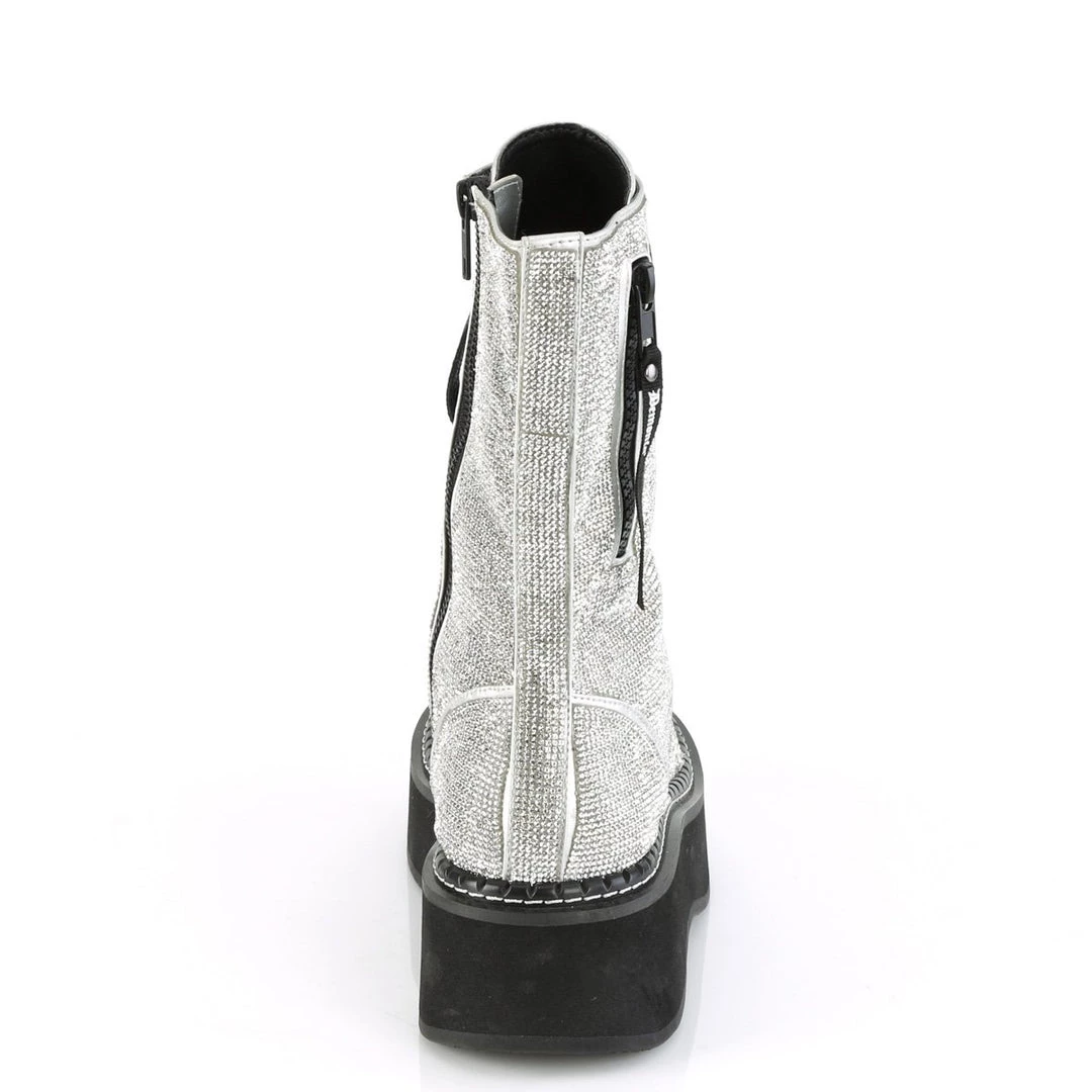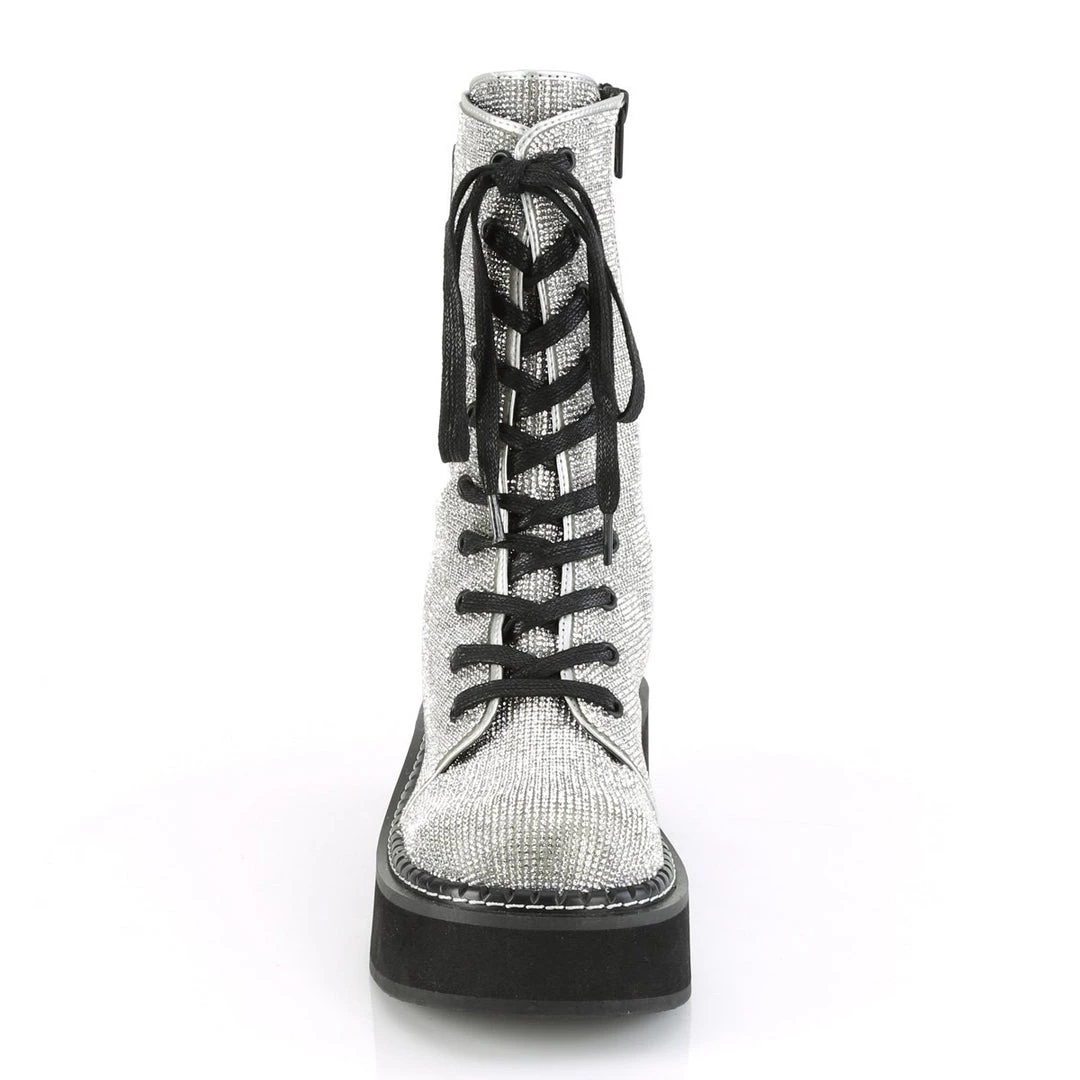 You will sparkle in these funky 2″ platform mid-calf lace-up boots featuring rhinestone covered upper & outer metal zipper pocket with inside metal zip closure.