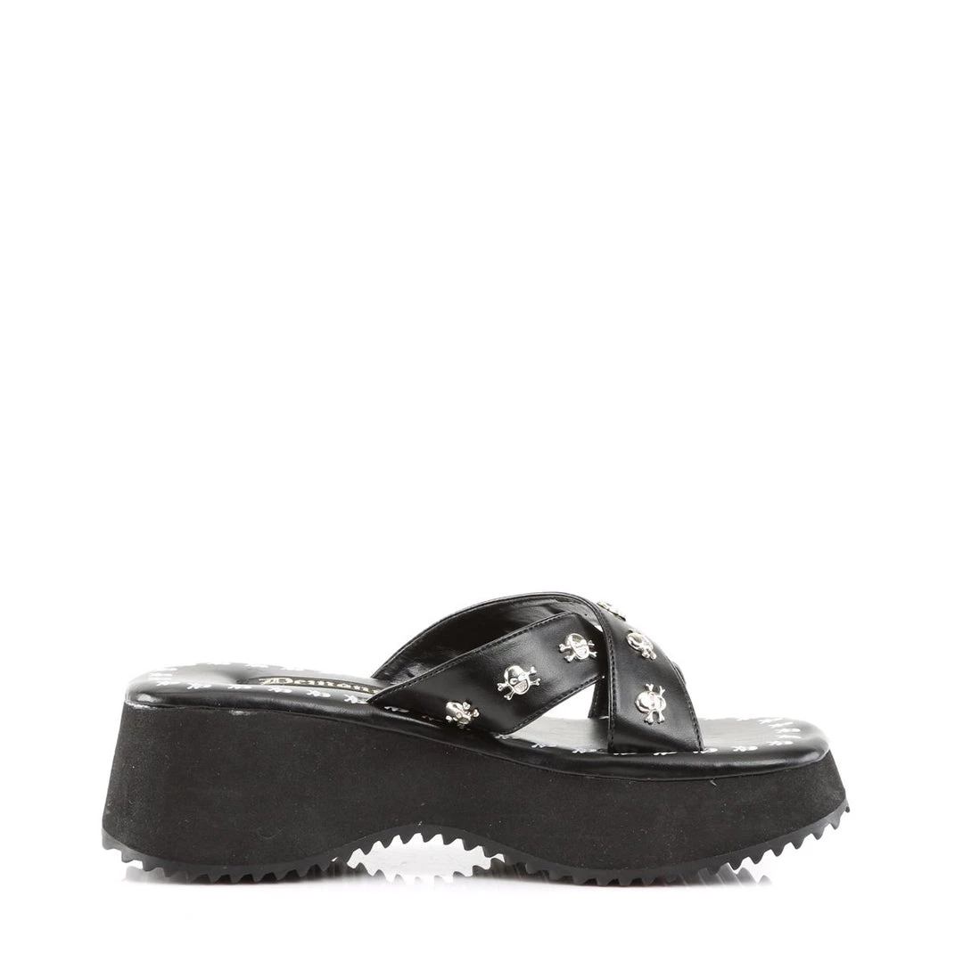 Add some edge to your look with these seriously scary 2 1/2″ platform slides with skull ornamentation. This deceptively simple slide features lots of skull-and-bones charm for a cheerily dark look.