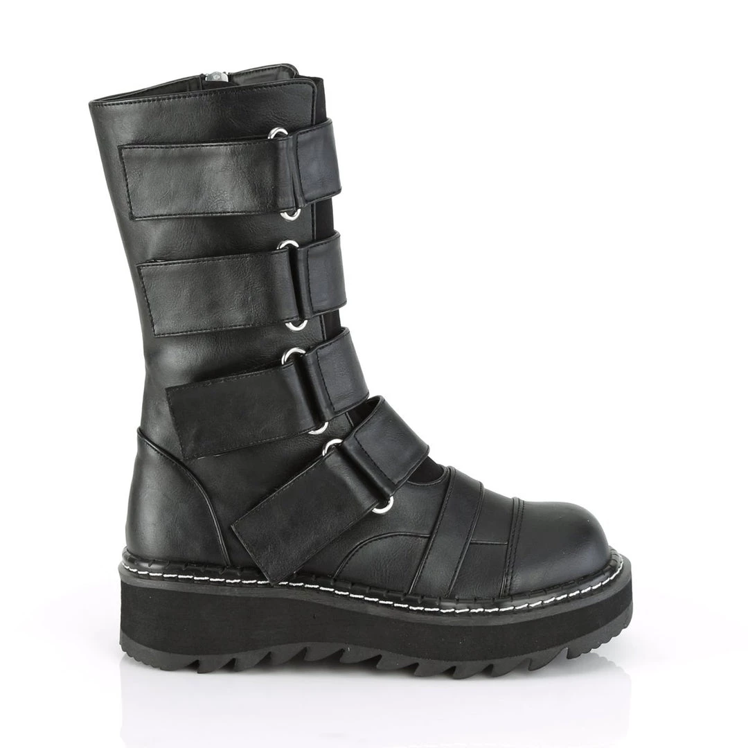 All about straps! Funky 1 1/4″ (32mm) platform front strap mid-calf boot featuring elastic front panel with 4 hoop n’ loop straps and side zip closure.