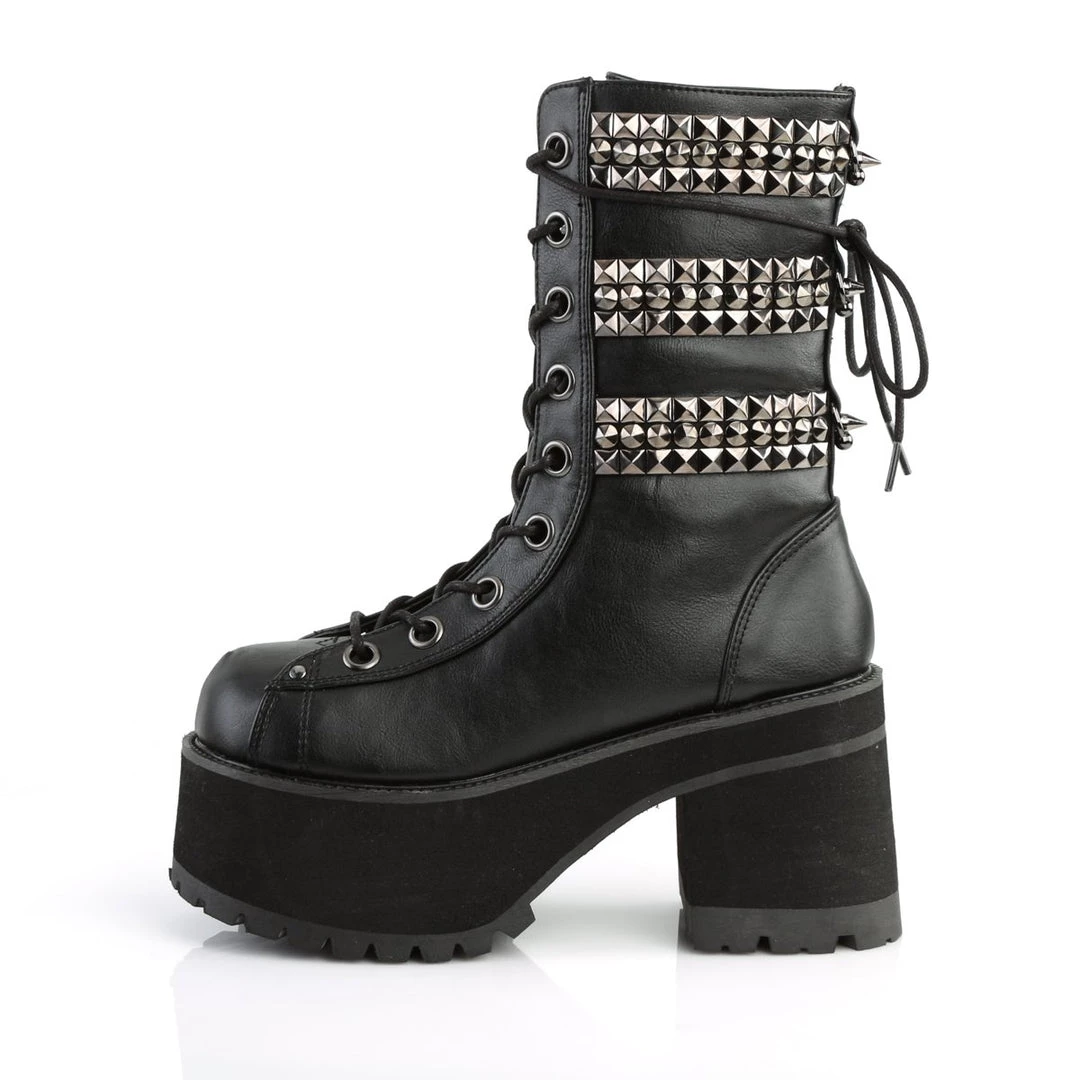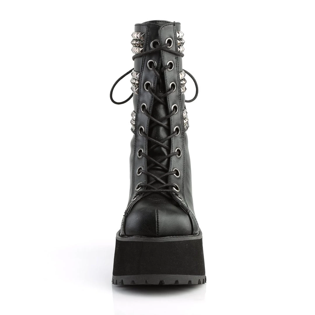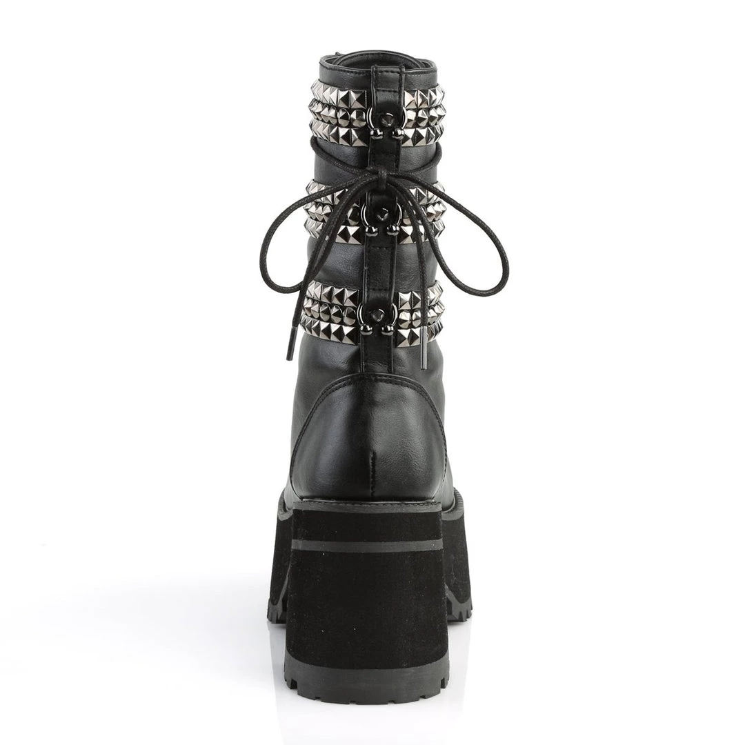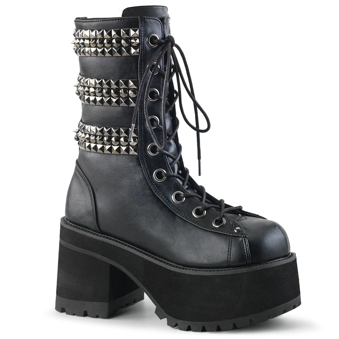 3 3/4″ (95mm) heel, 2 1/4″ (57mm) platform lace-up front ankle boot featuring triple studded ornamental straps & pyramid stud & horseshoe rings at back.