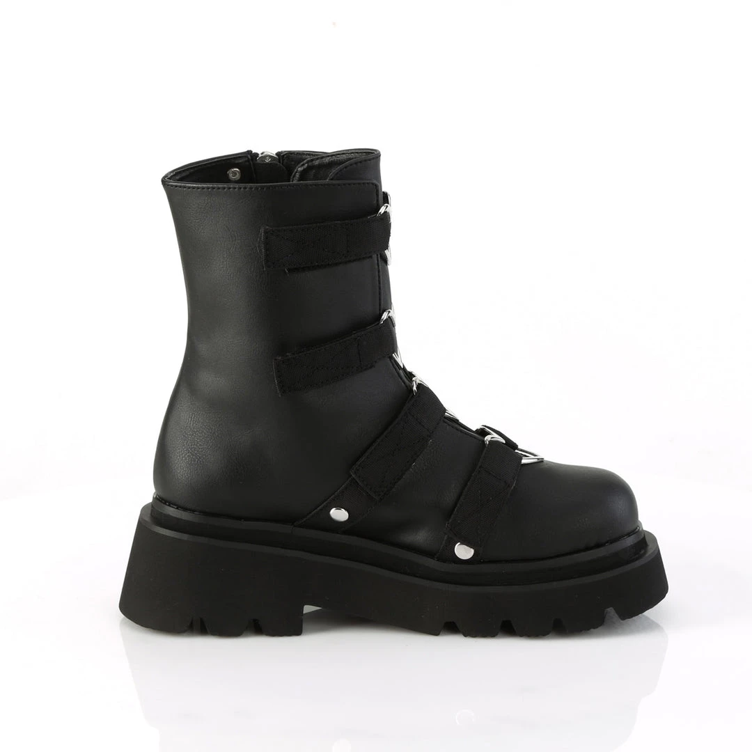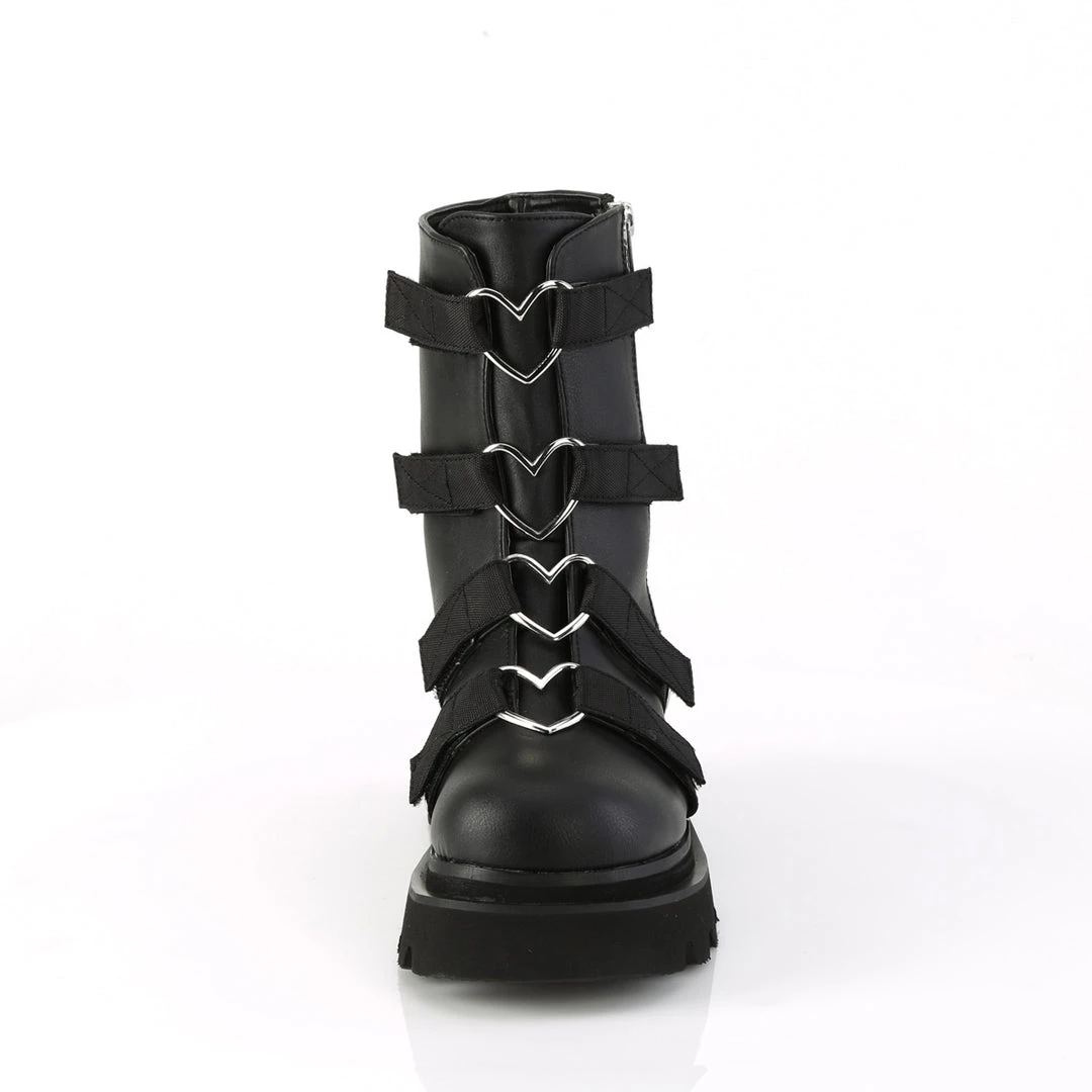Look adorable everywhere you go! A 2 1/2″ (64mm) tiered platform strappy ankle boot featuring metal heart rings & outer and inner nylon hook N loop straps, outer side metal zip closure.