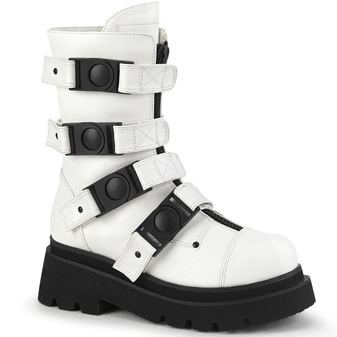 Stand out from the crowd! Funky 2 1/2″ tiered platform strappy calf high boot featuring quick release plastic buckle straps with center front metal zip closure.