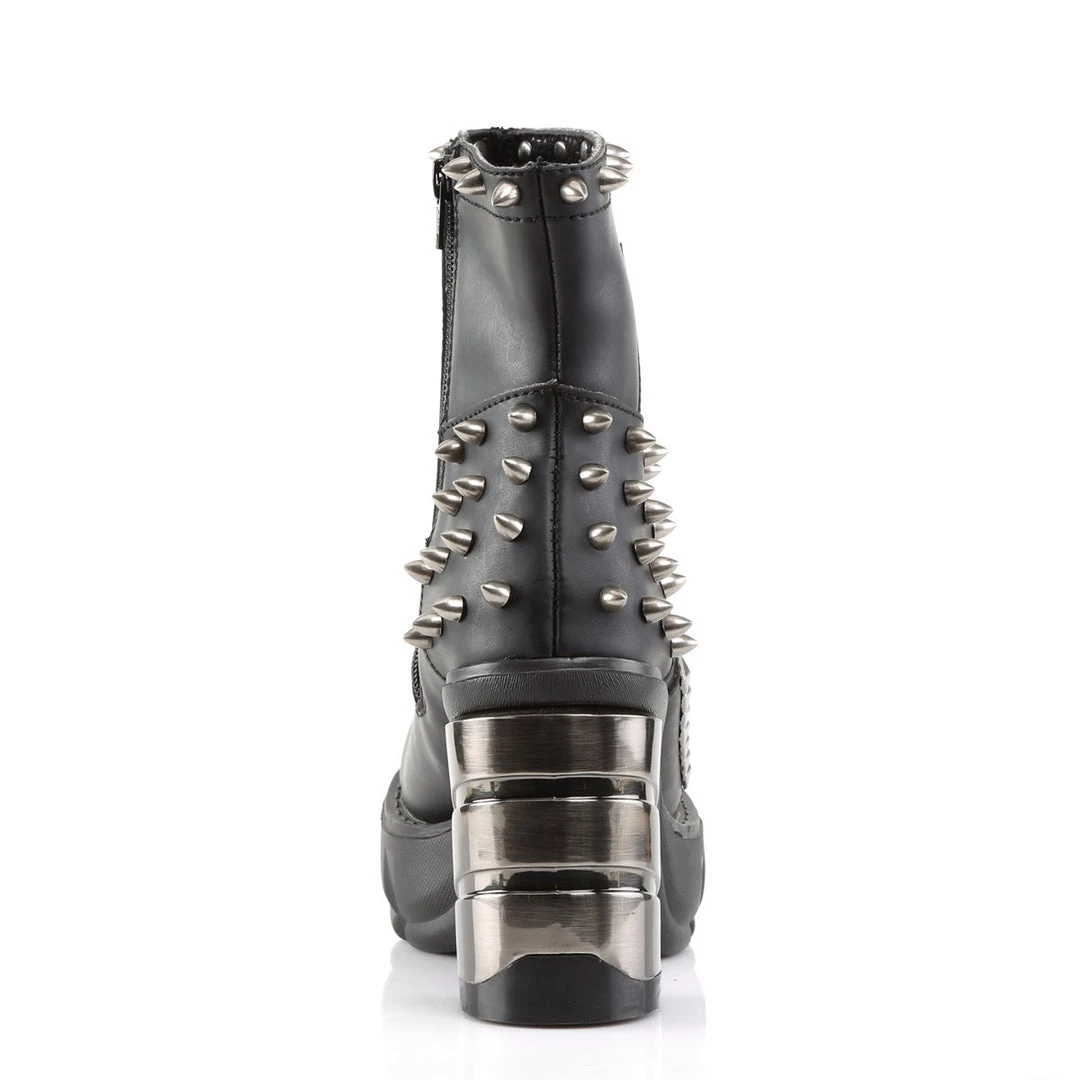 A Patchwork Ankle Bootie With Spikes & Pyramid Studs and brushed chrome ABS heel. These boots have a full side zipper.