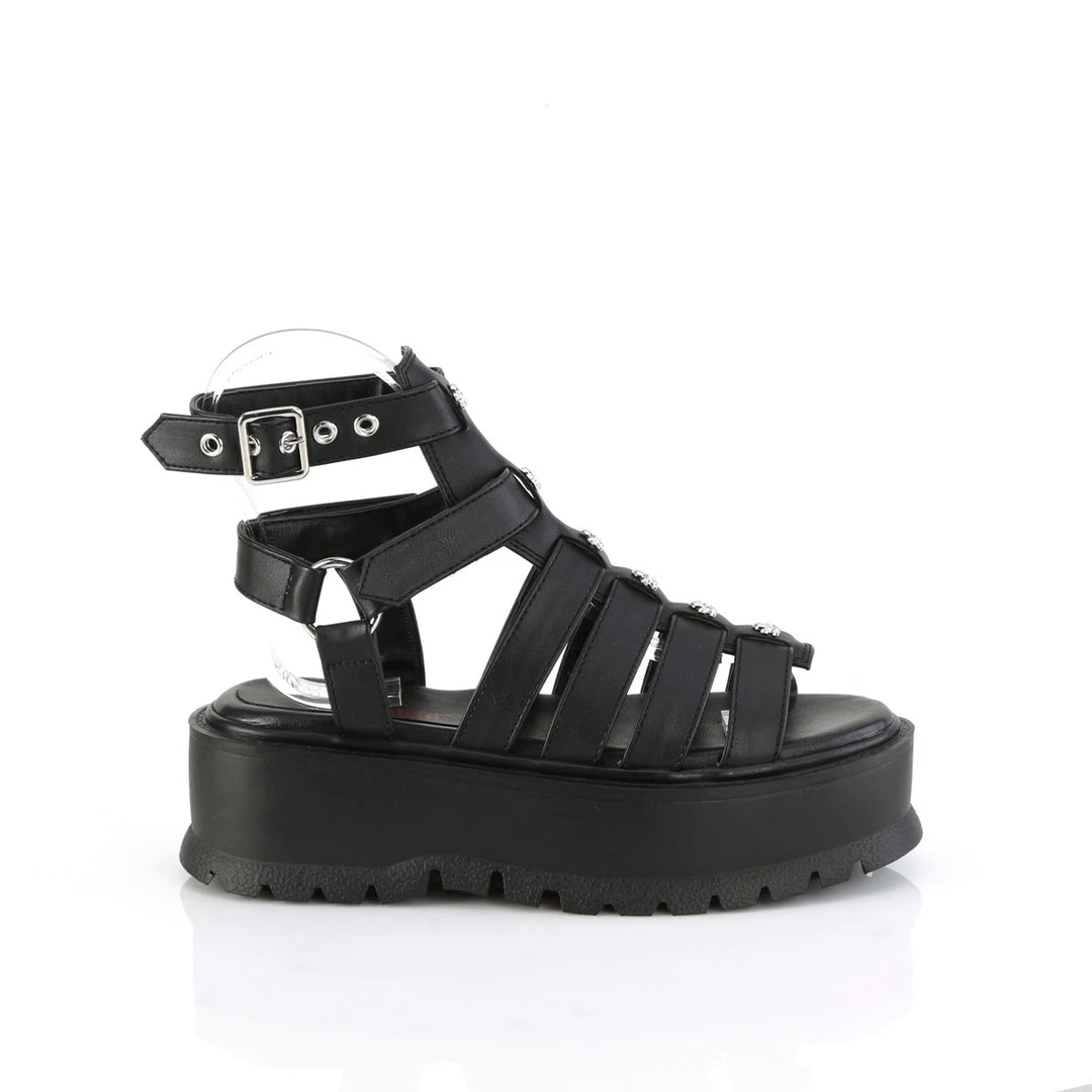 Stylish looking 2″ platform gladiator sandal featuring skull N’ crossbones studs up the center, hook N’ loop bottom strap, and buckle top strap.