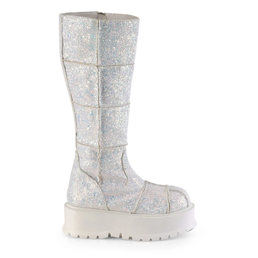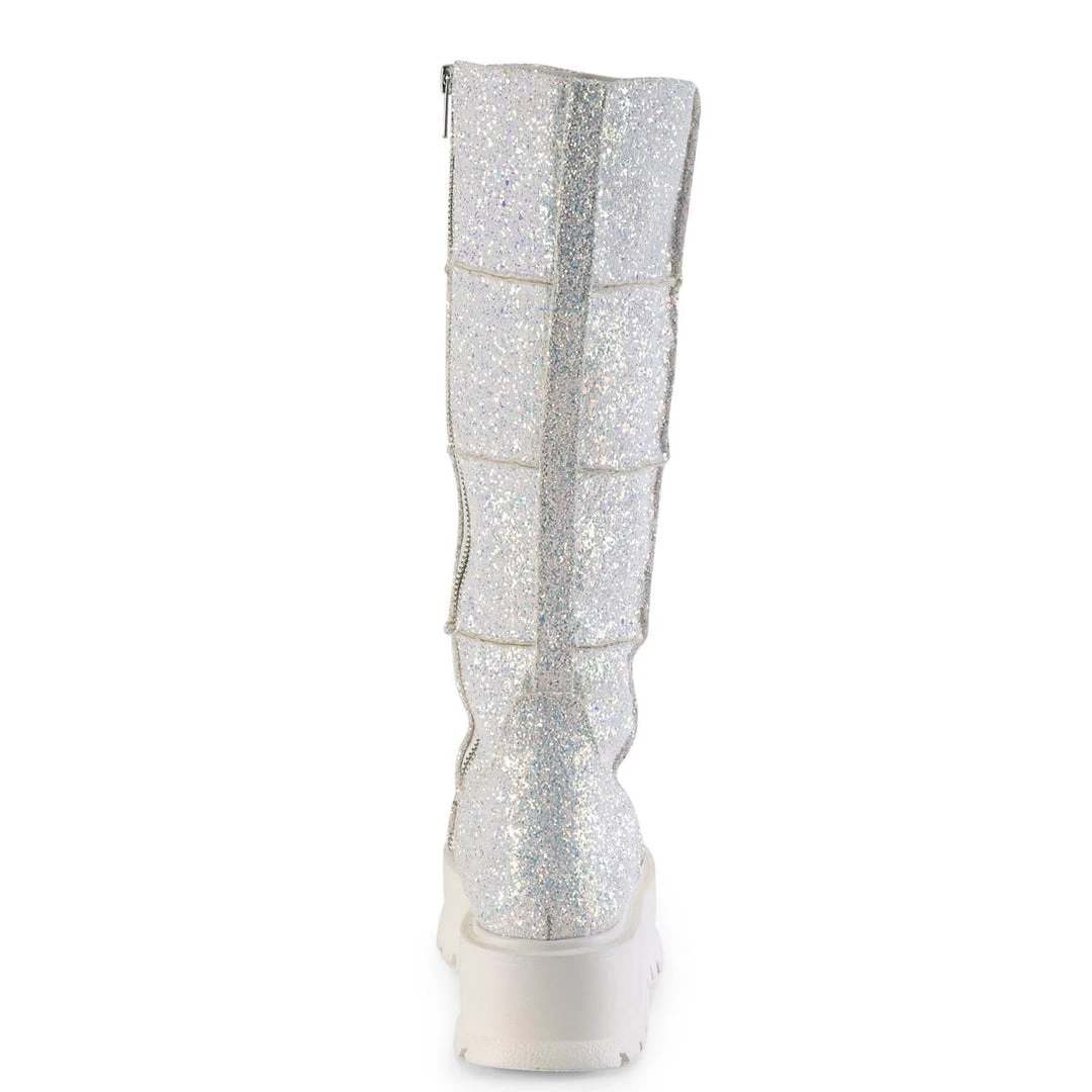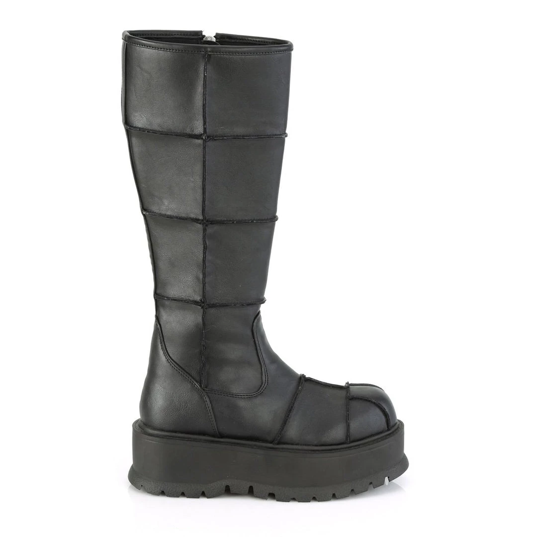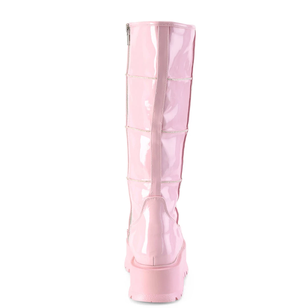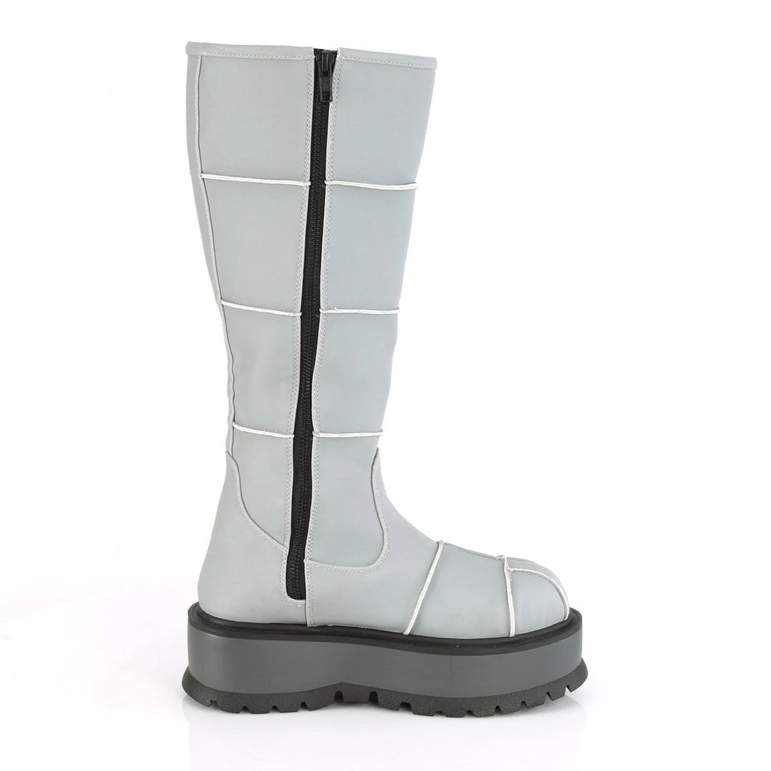 Stomp around in these funky 2″ (51mm) platform knee high boot with patching details, and full length inside metal zip closure.