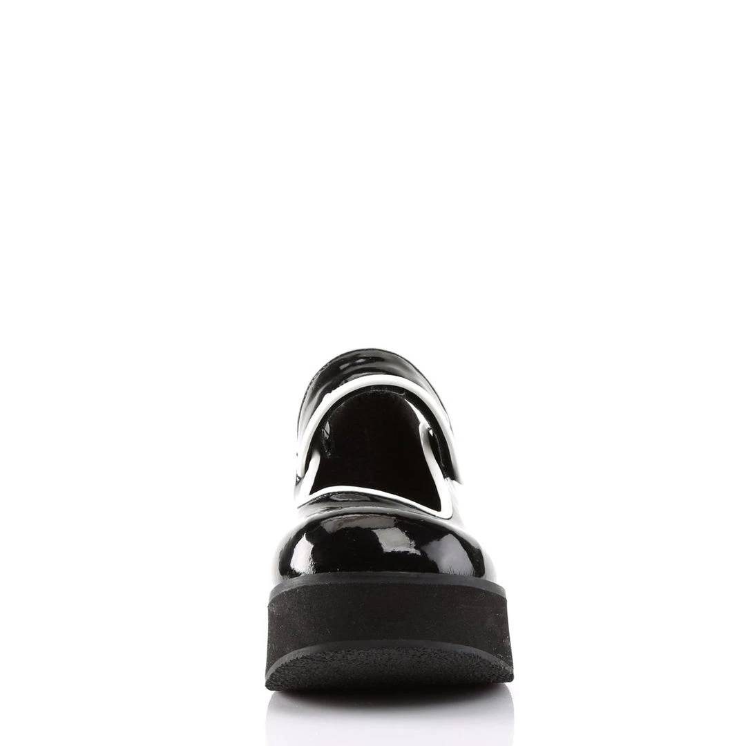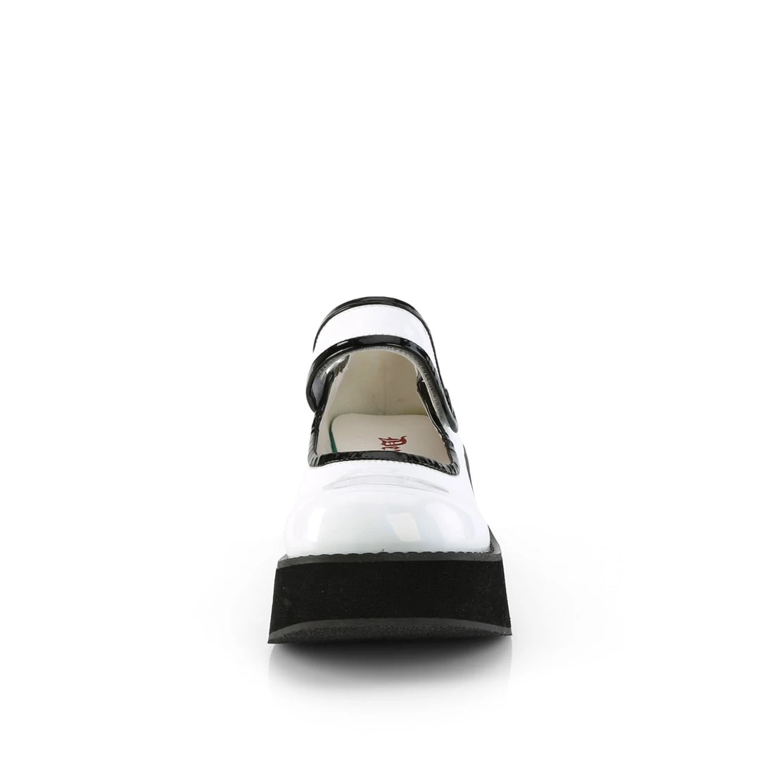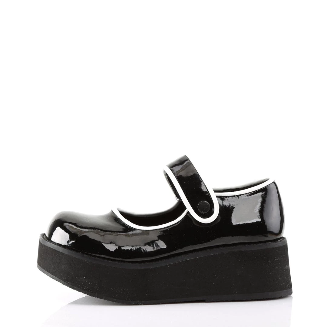 The gleaming upper is trimmed with either red or white contrast features a sweet Mary Jane adjustable strap over the foot, a round toe and a platform bottom. The on-trend platform gives you a flattering boost. Pair with a flirty miniskirt or skinny jeans.