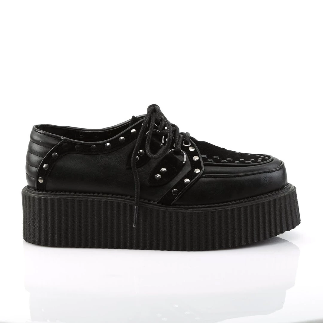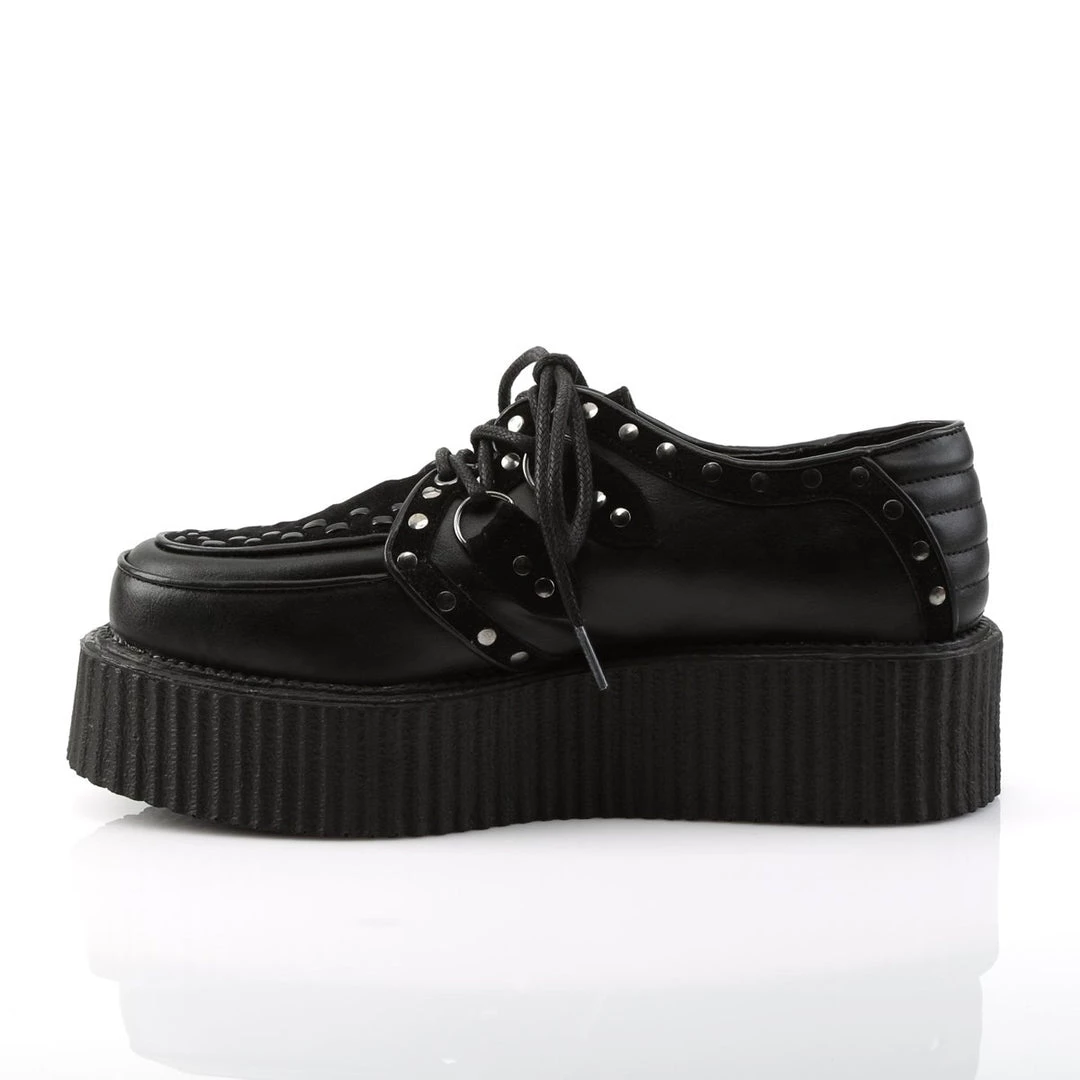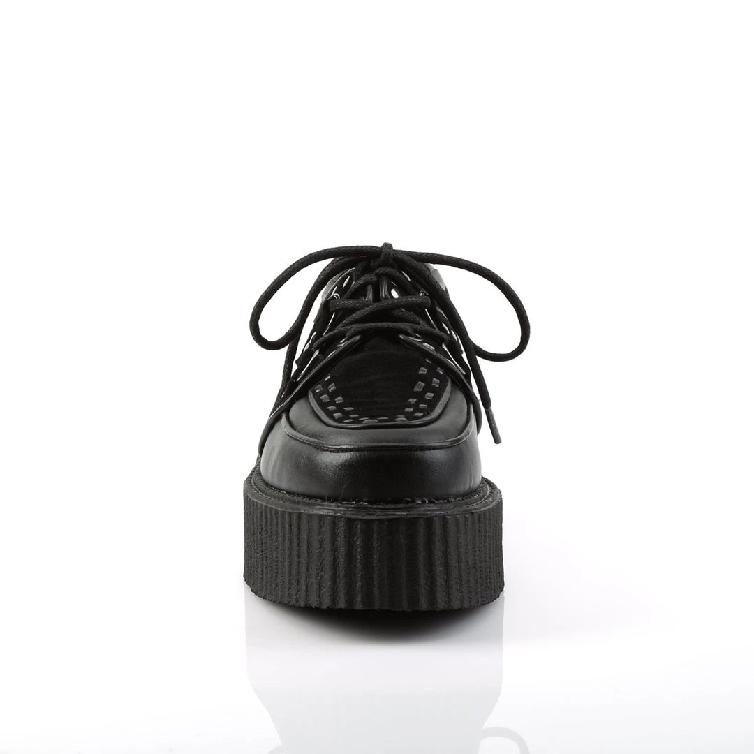 Cool and comfortable 2″ (5cm) platform lace creeper featuring stud & faux suede accents throughout upper part of the shoe. Men’s sizing. Unisex Creepers