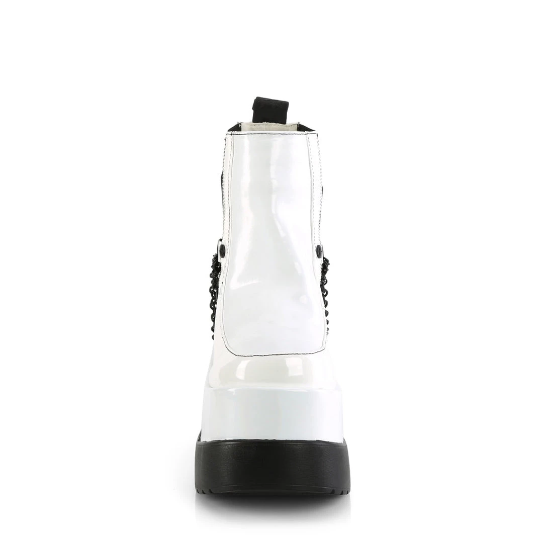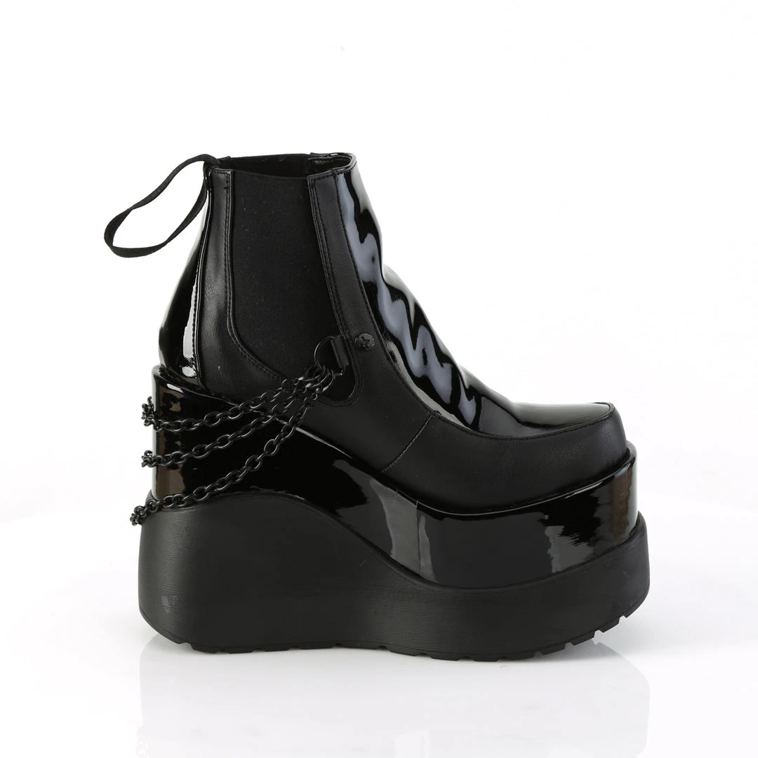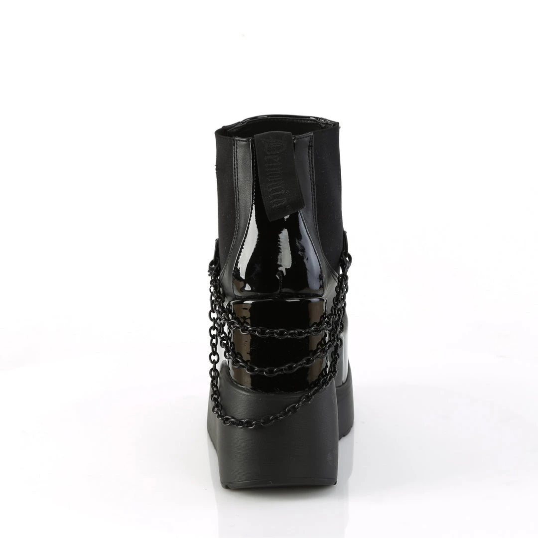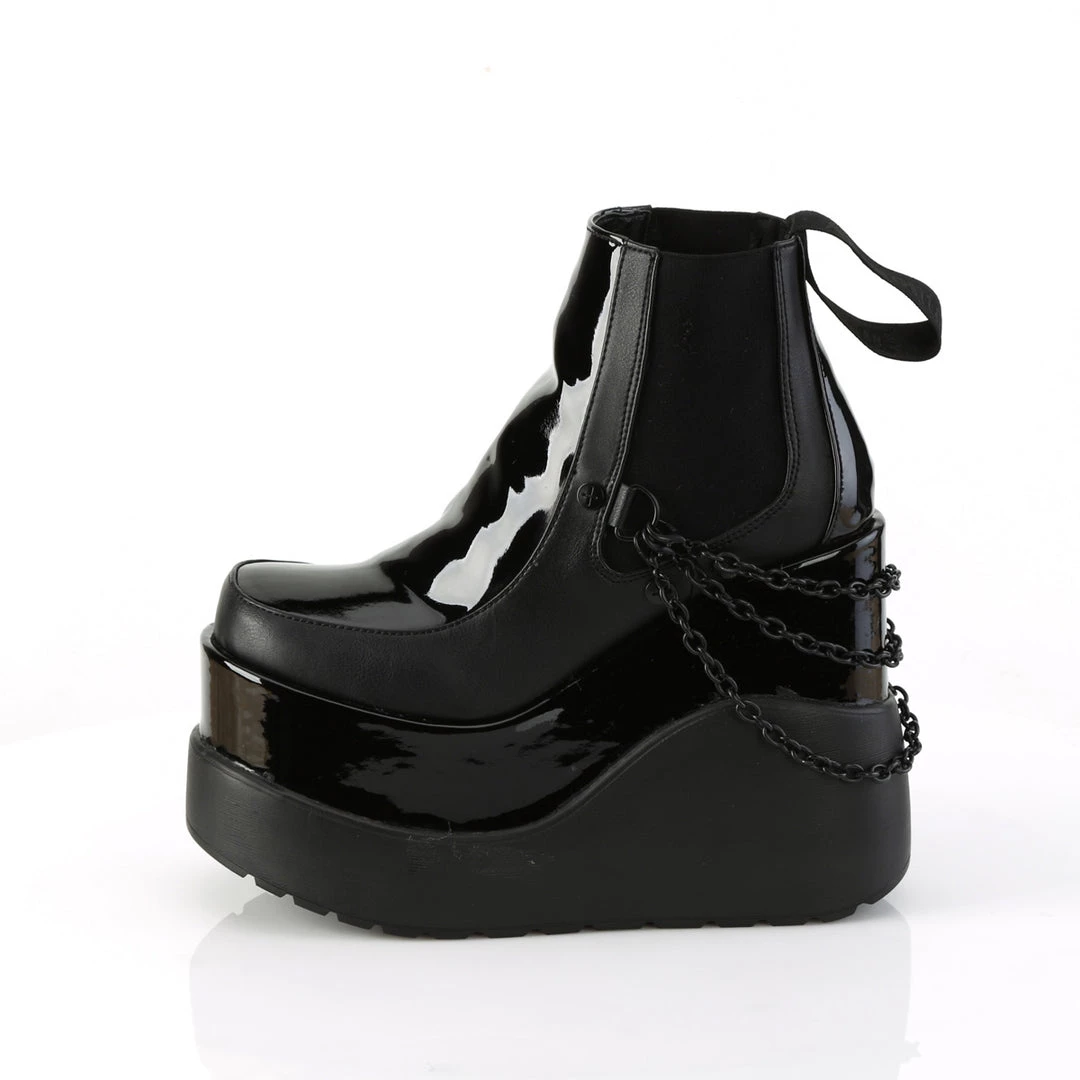 Give yourself a much-deserved treat! A 5″ (127mm) wedge tiered platform chelsea style ankle boot w/ elastic side panels & swivel hook cascading chain detail.