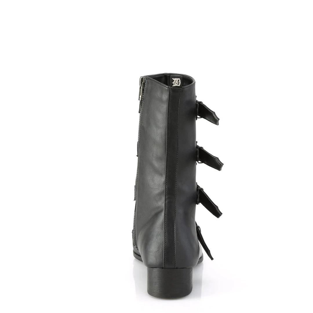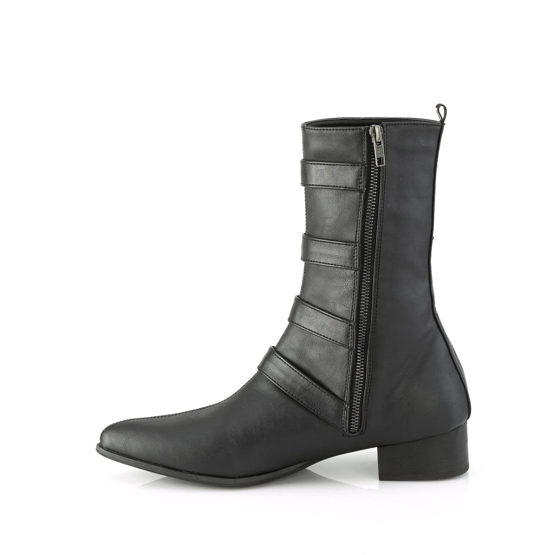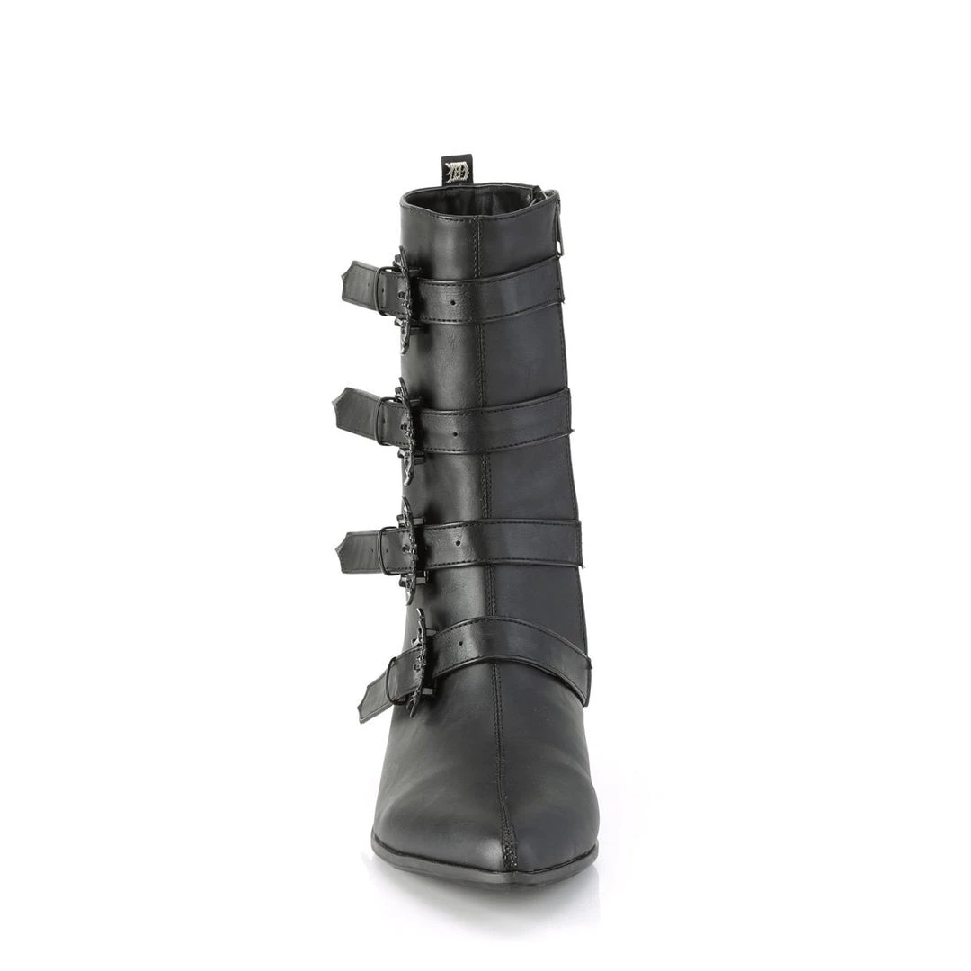 Creepily funky 1 1/2″ (38mm) block heel pointed toe Winklepicker style mid-calf boot, featuring multi bat buckle straps with inside zip closure.