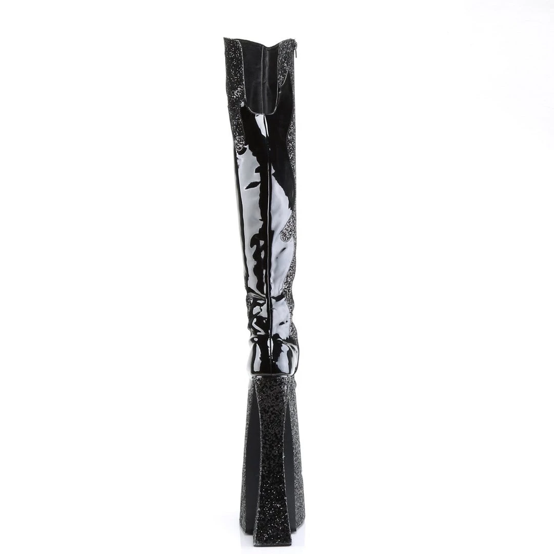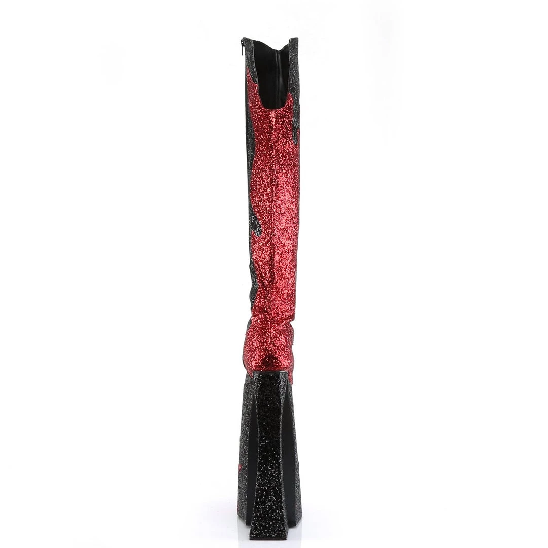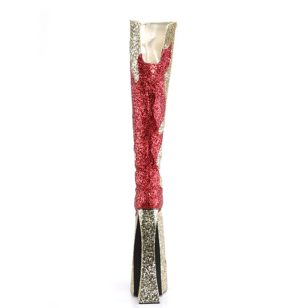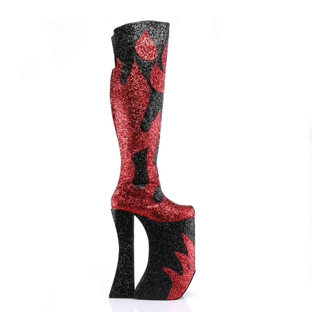 Rock out in these over the top boots. Featuring a flame detail with glitter panels, an inner side zip, and an 11 platform heel. The ultimate extension for those who live the lifestyle or those who just wish to spice it up again, Devious offers a fierce line of footwear to play with.