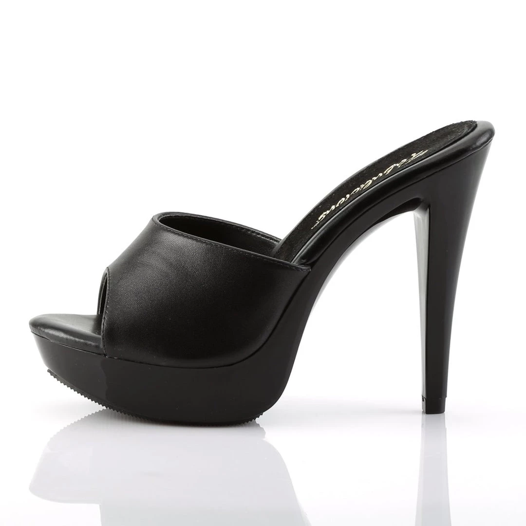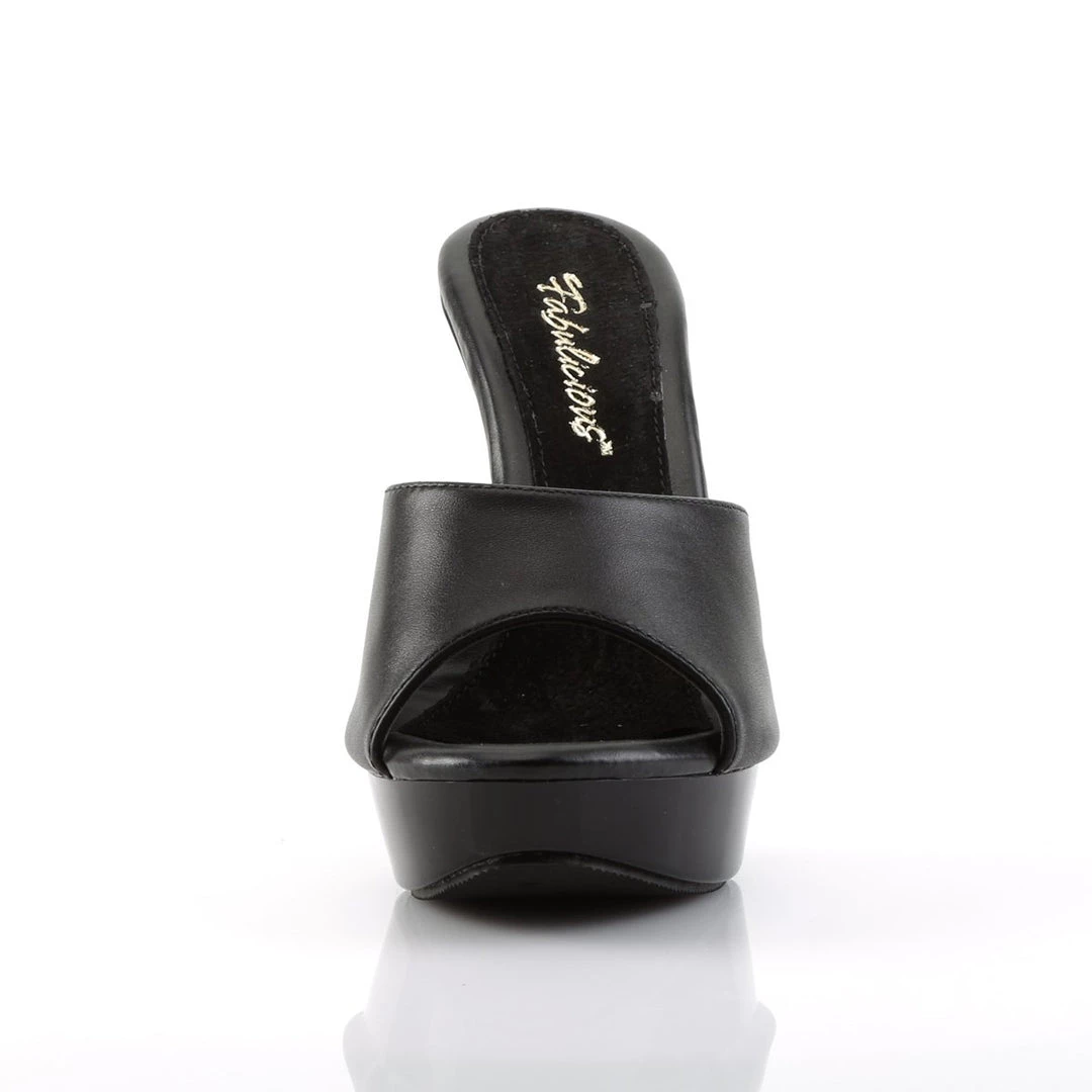 Classic open-toe mini platform leatehr slide in black featuring single top strap with round cuts on both edges, matching black cushioning and black 5 inch (12.5 cm) high stiletto heels. Crafted with great attention to detail, these shoes are the best example of timeless elegance and sex appeal.
