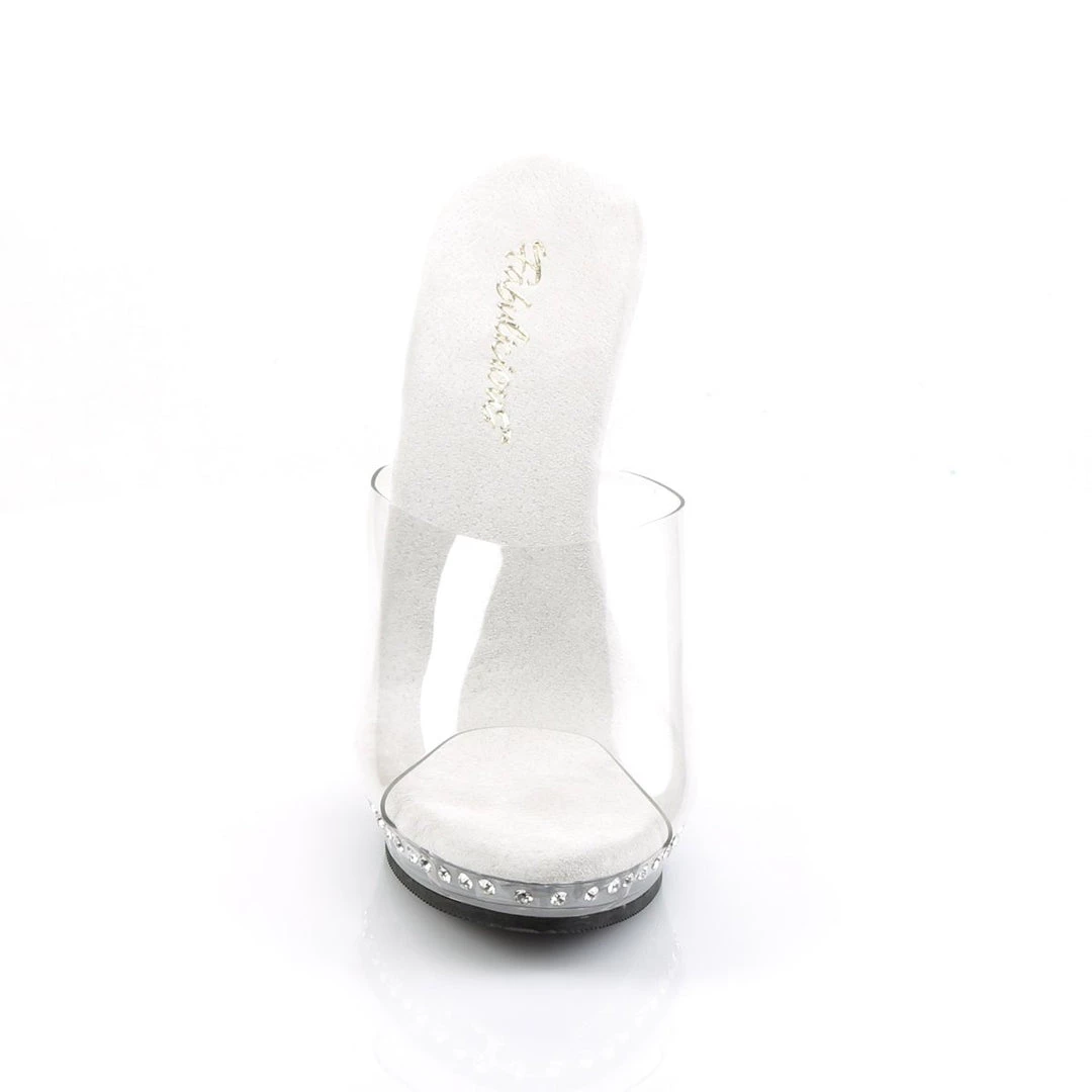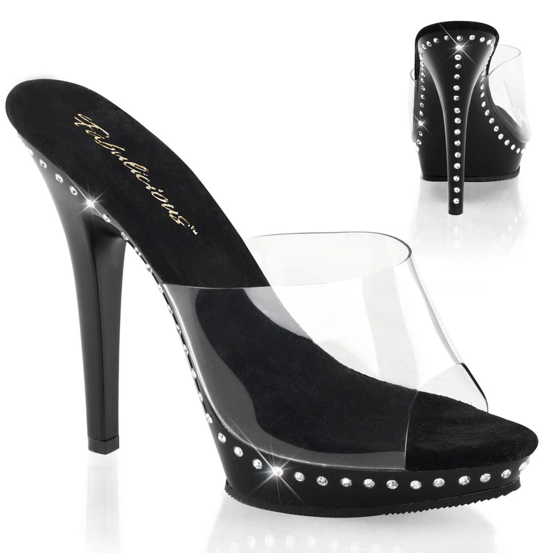 A mule style with a tapered round open toe. 5 inch (12.5 cm) high stiletto heels complemented by a chic 0.75 inch (2 cm) front platform with soft cushioning. Featuring one line of crystals adorning heel and platform. Its padded, sueded footbed helps keep you comfy all the while.