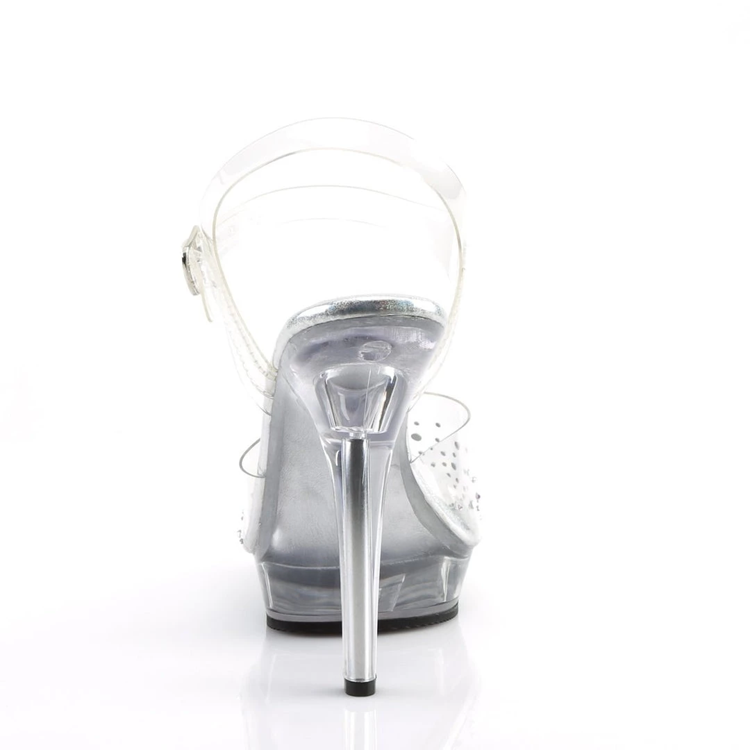Classic styled 5″ heel, 3/4″ platform ankle strap sandals with rhinestone embellishments.