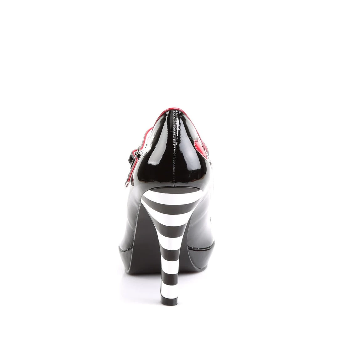 A Alice & Wonderland, Queen of Hearts Pump. These sleek mary janes feature a patent leather upper, 4 heels adorned with clubs, hearts, diamonds, and spades on the outside and inside lining.