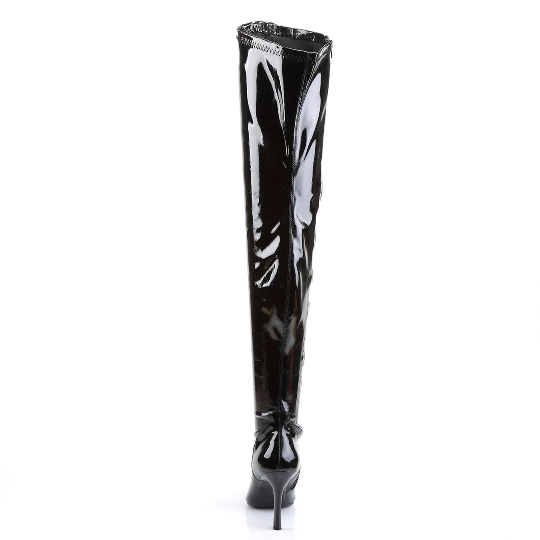 The glossy faux patent boots pulls on easily and hugs your curves in all the right places. The pointed toe, stiletto heel, and mid-thigh cut are striking enough to turn every head as you walk by. Attract attention in these sexy boots. They feature a thigh high height with a high heel and stylishly pointed toe.