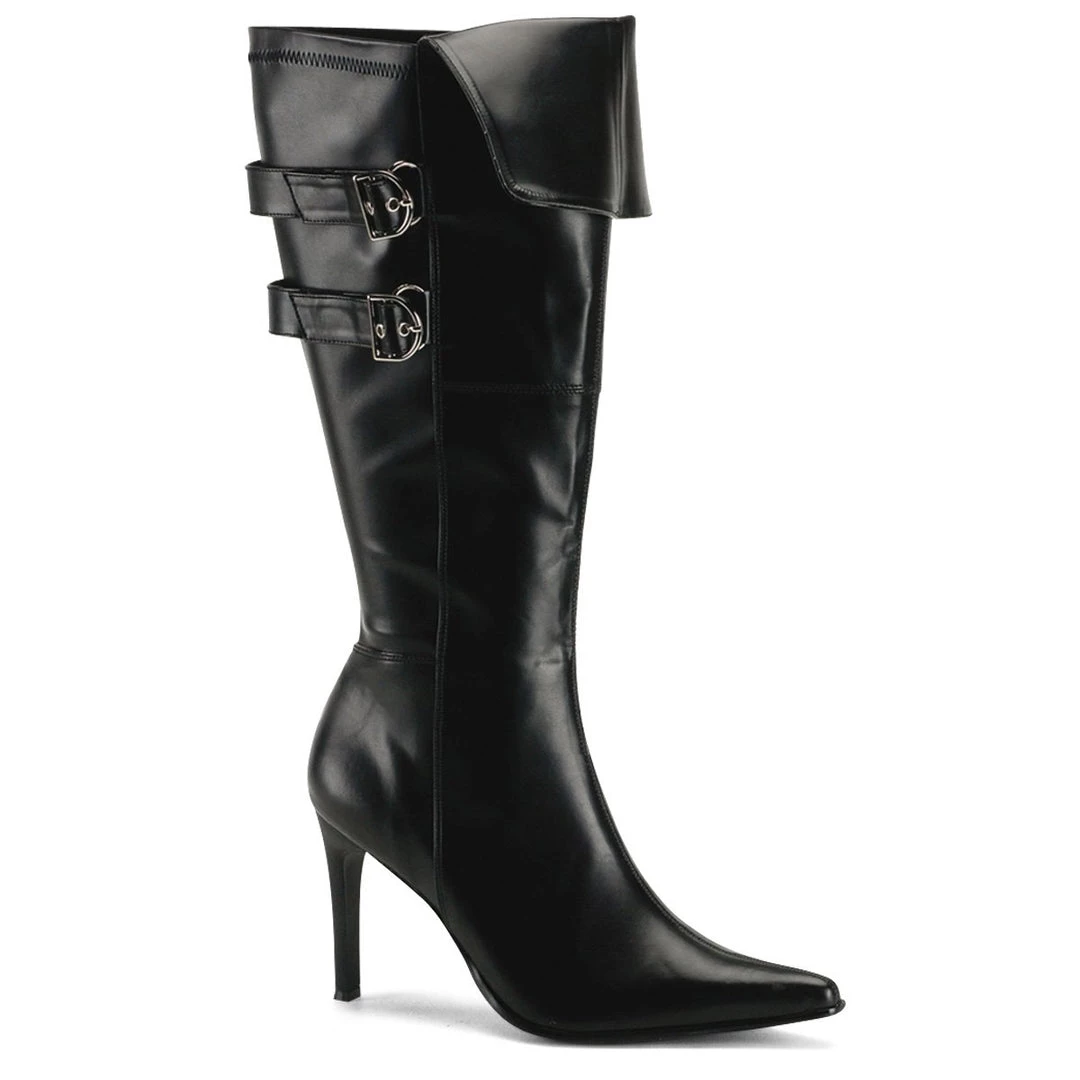 The sleek, supple upper features two buckled straps around the back of the calf, a higher shaft on the front of the leg that can be turned down for a cuff effect, and a side zipper for an easy on and off. A slightly pointed toe and sky-high heel are feminine and foxy, making this a shoe that will definitely shiver someone’s timbers. Navigate your way through the seven seas in these sexy pirate boots. They have a pointed toe and a three and three quarter inch heel.