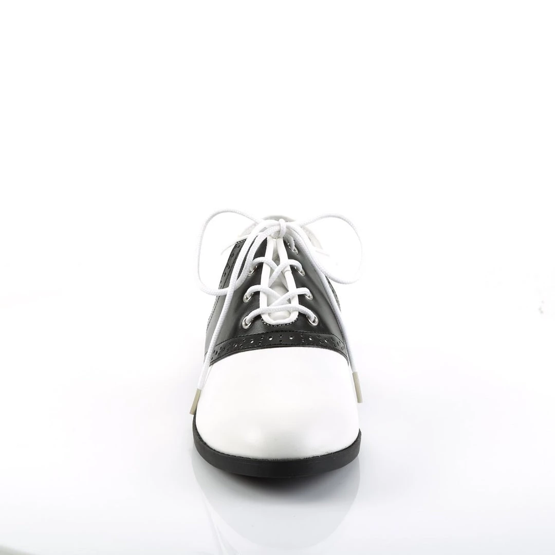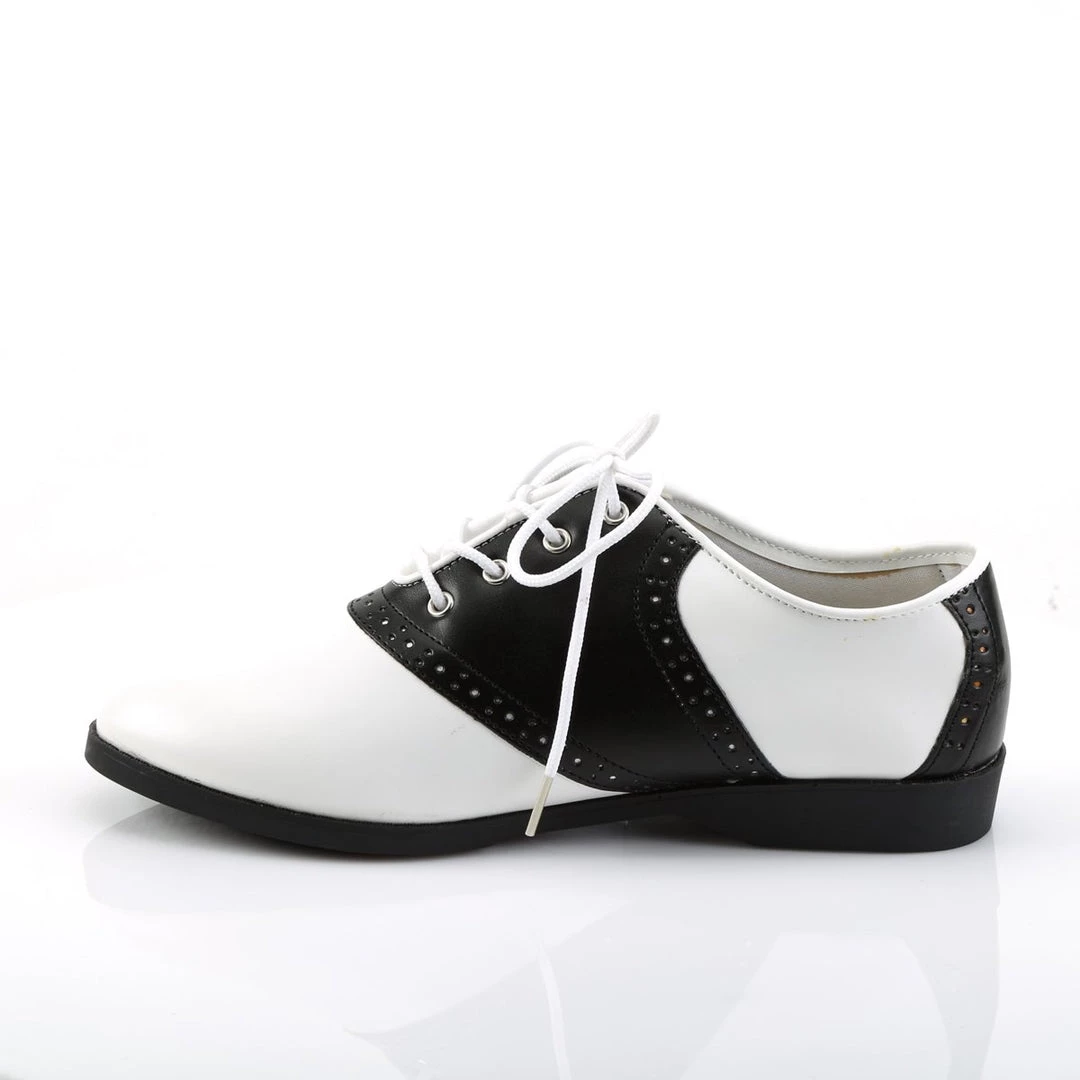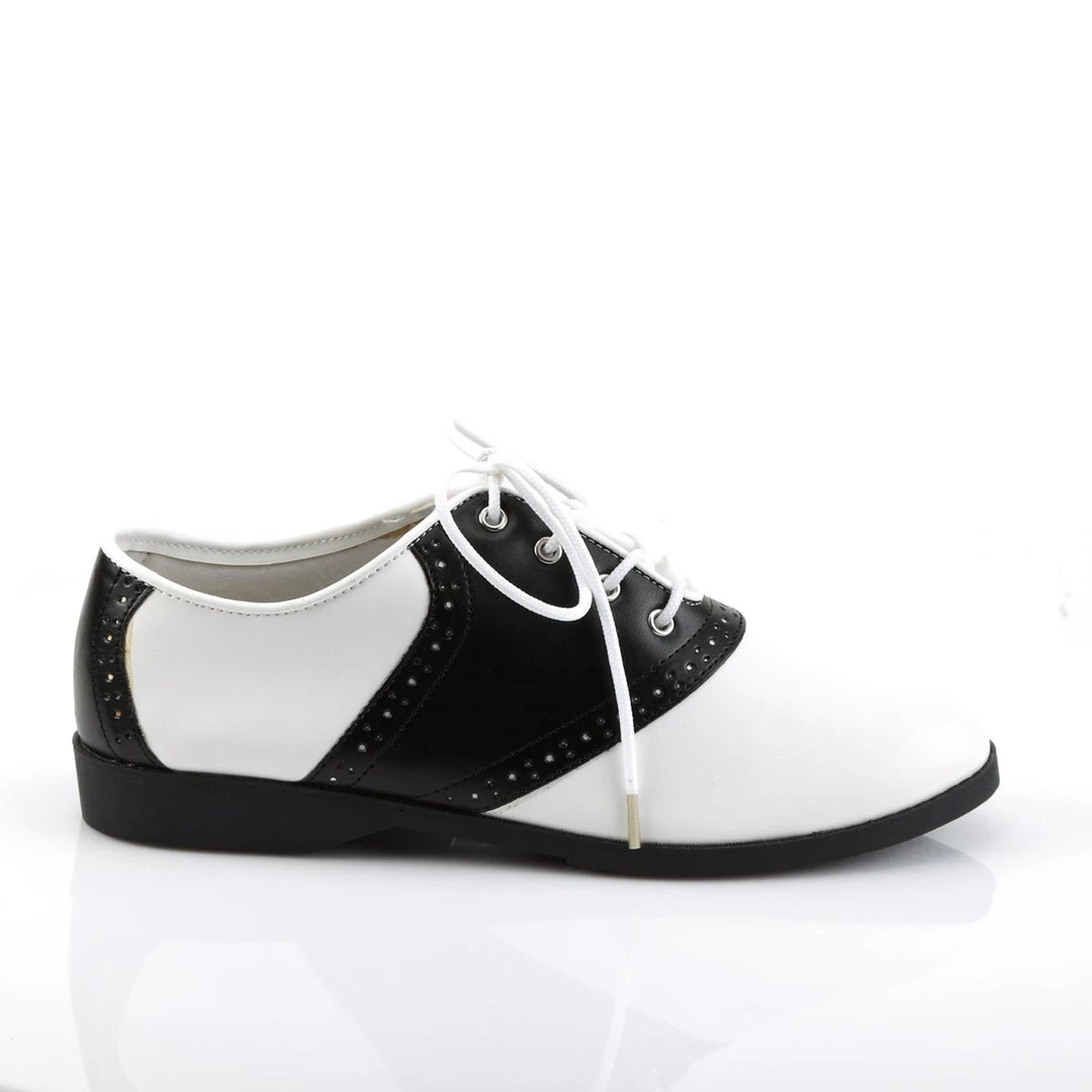A Flat Saddle Retro Shoes from Funtasma by Pleaser. The shoe has a lace-up front, perforated trim, and the classic two-tone look that’s easily recognizable. Just right for wearing with a variety of retro looks. These classic costume saddle shoes have a slight lift at the heel for comfortable wear. You will love this two tone flat saddle shoe.