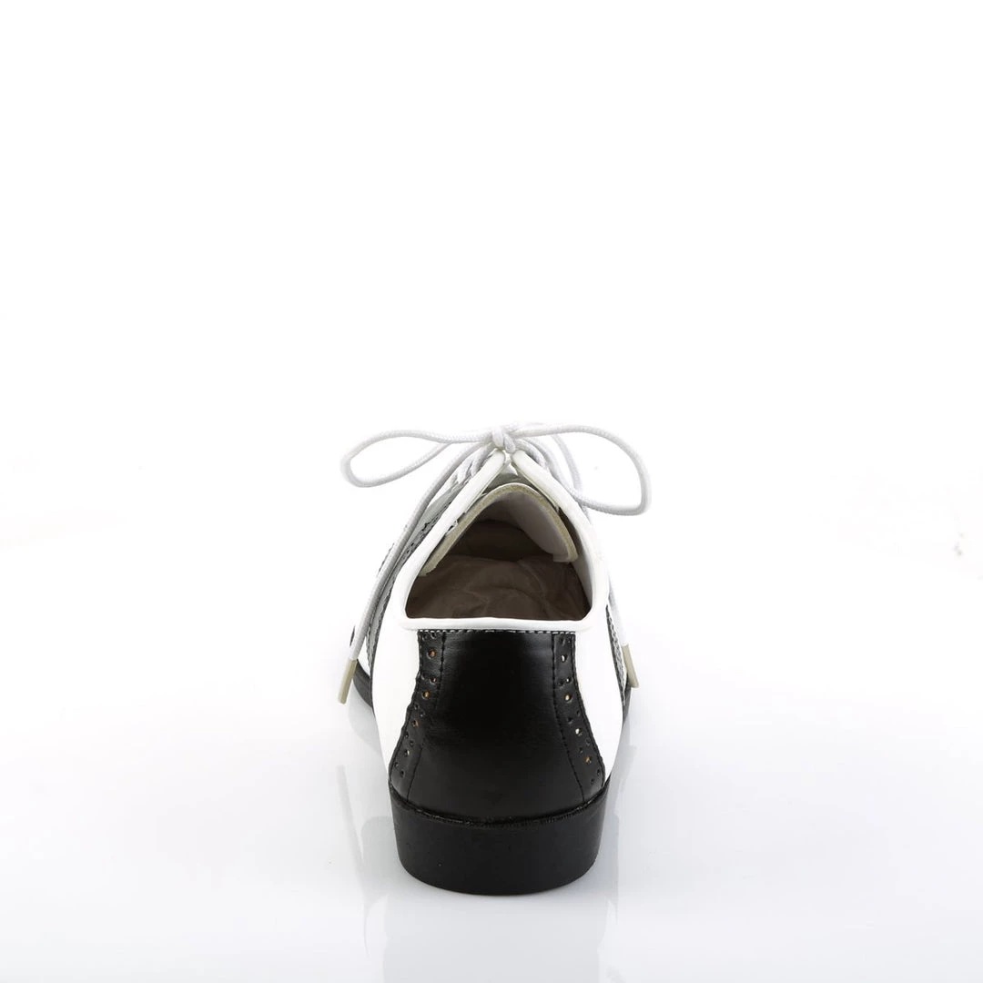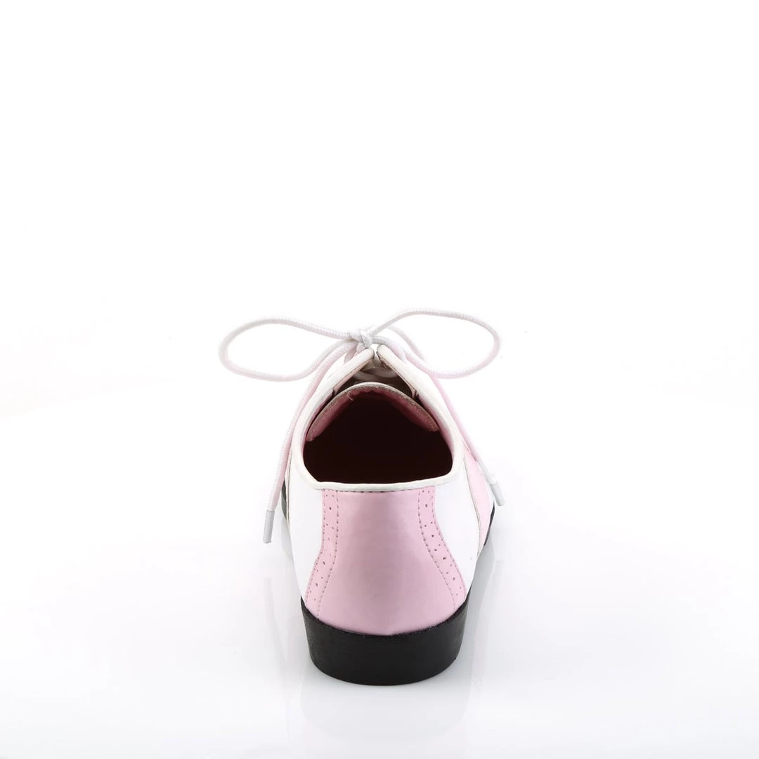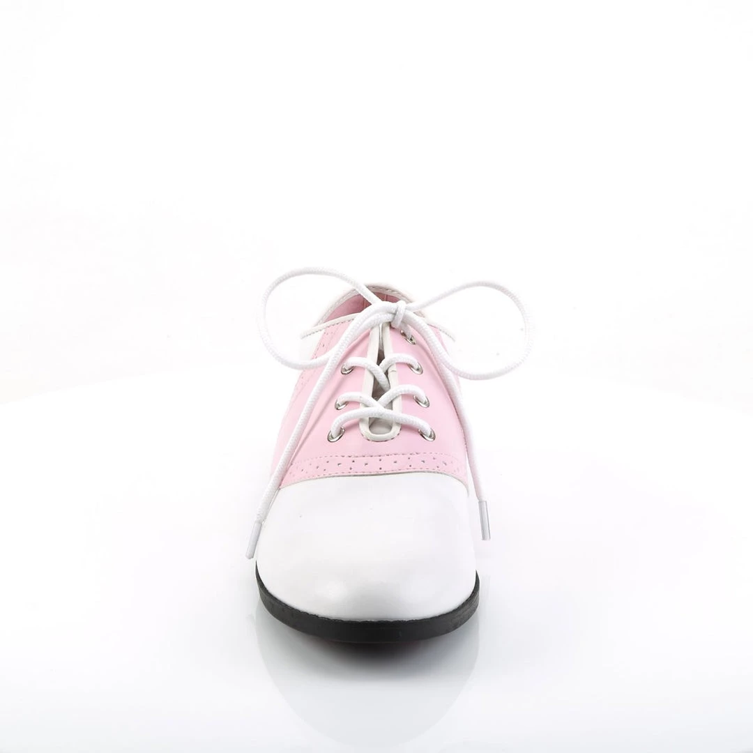 A Flat Saddle Retro Shoes from Funtasma by Pleaser. The shoe has a lace-up front, perforated trim, and the classic two-tone look that’s easily recognizable. Just right for wearing with a variety of retro looks. These classic costume saddle shoes have a slight lift at the heel for comfortable wear. You will love this two tone flat saddle shoe.
