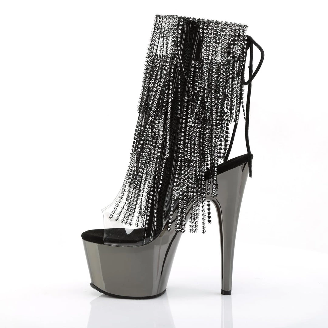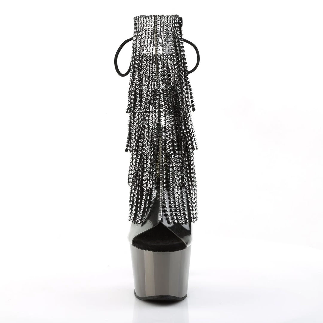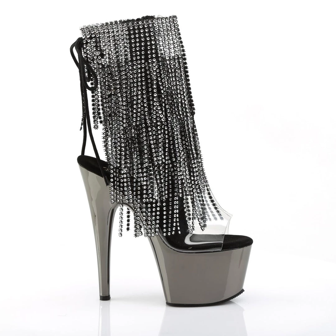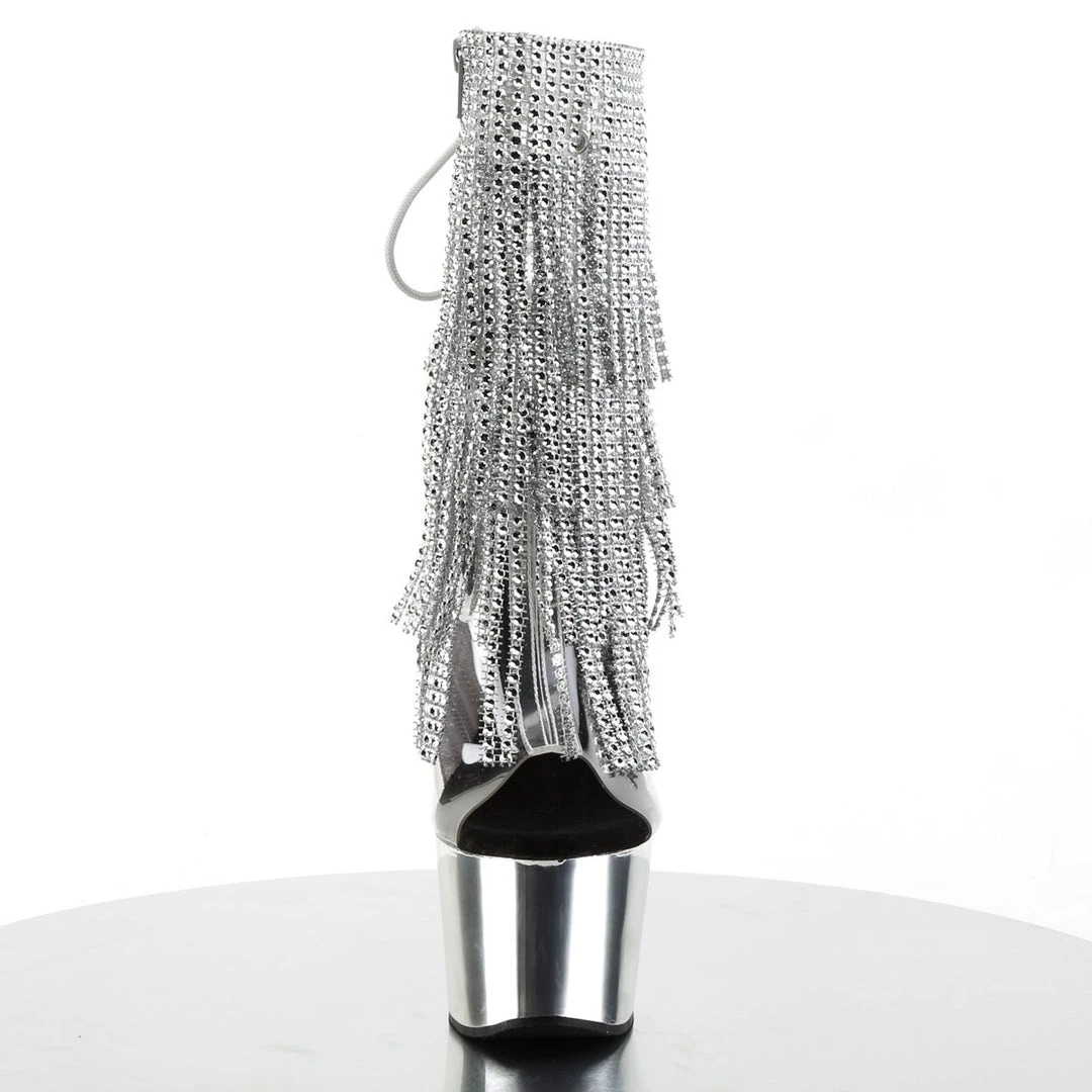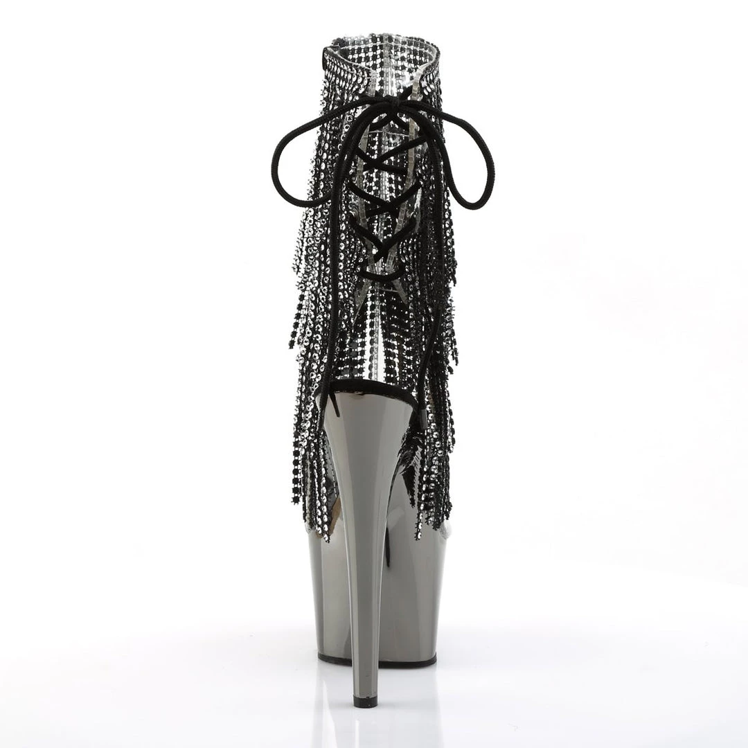 These Sparkling Chrome Plated Platform Open Toe/Heel Back Lace-Up Ankle Boot Featuring 4-Layer Chrome Plated, Simulated Rhinestone Fringe, Inside Zip Closure.