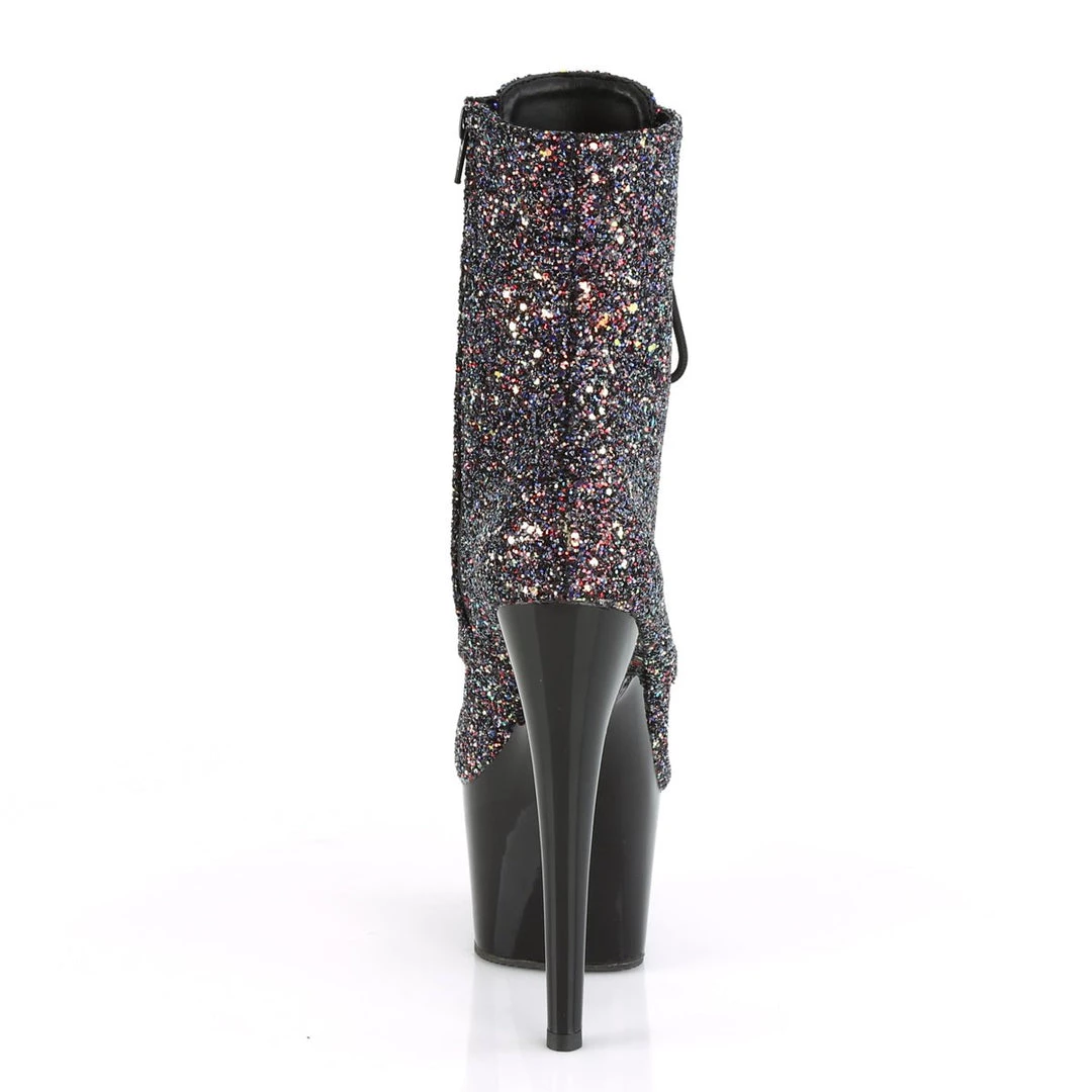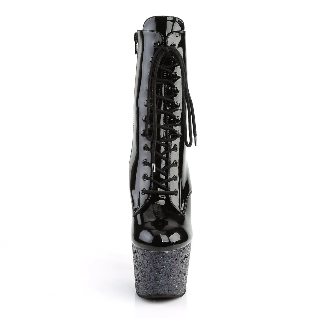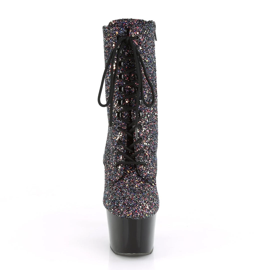 Sparkle in these gorgeous 7″ (178mm) heel, 2 3/4″ (70mm) platform front lace-up ankle boots.These boots feature an inside zip closure for easy wear and go!