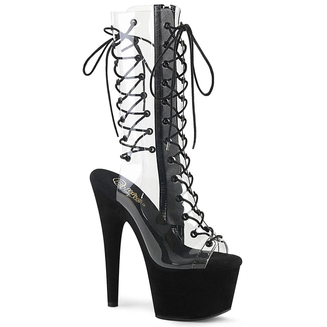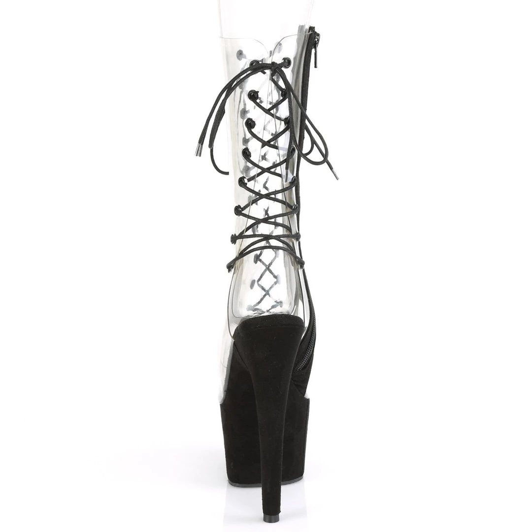 Versatile and sexy as hell! 7″ (178mm) heel, 2 3/4″ (70mm) platform lace-up front/back open toe/heel mid calf boot featuring fully wrapped platform bottom with inside zip closure.