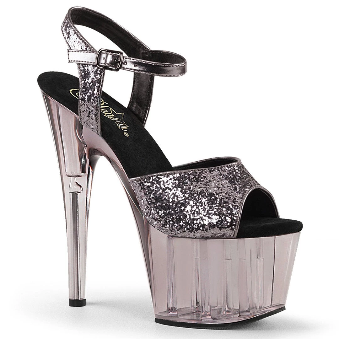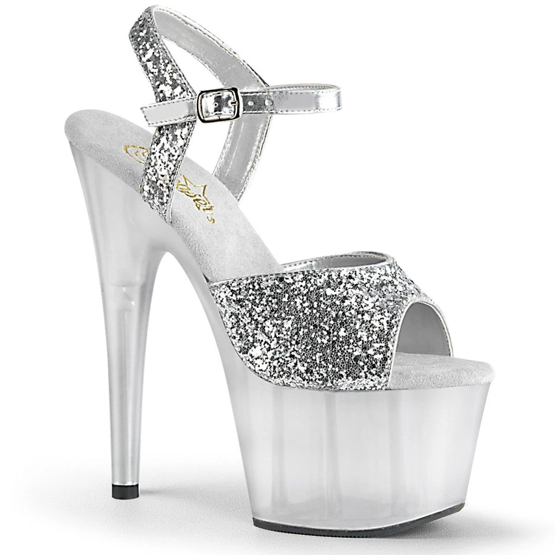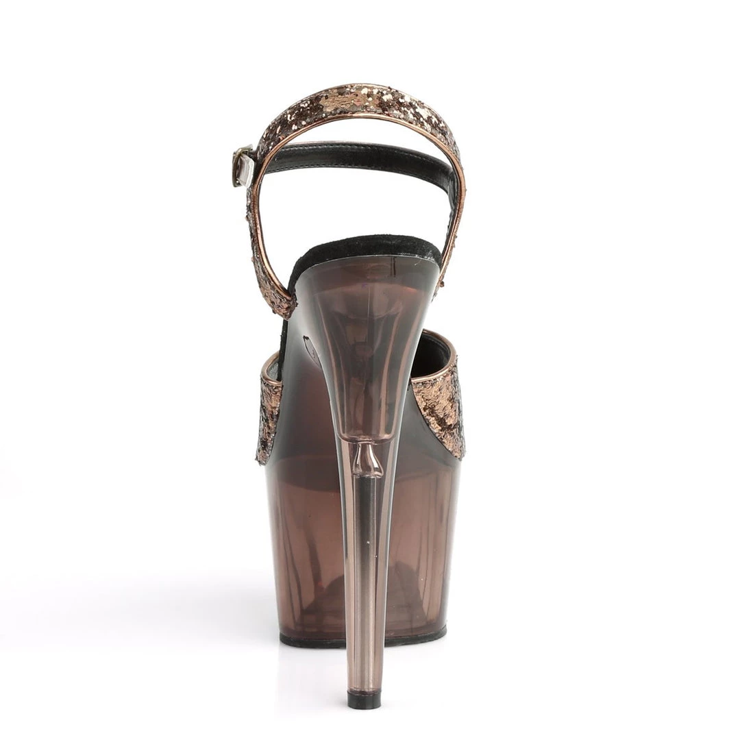 Gorgeous 7″(17.8cm) heel, 2 3/4″(7cm) tinted platform ankle strap sandal. You will attract all the right attention with these glittery sandals.