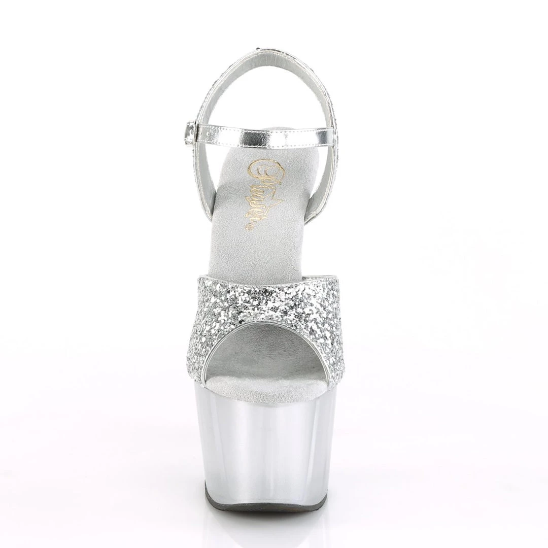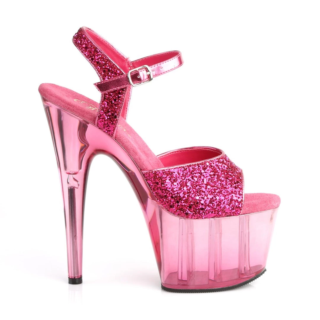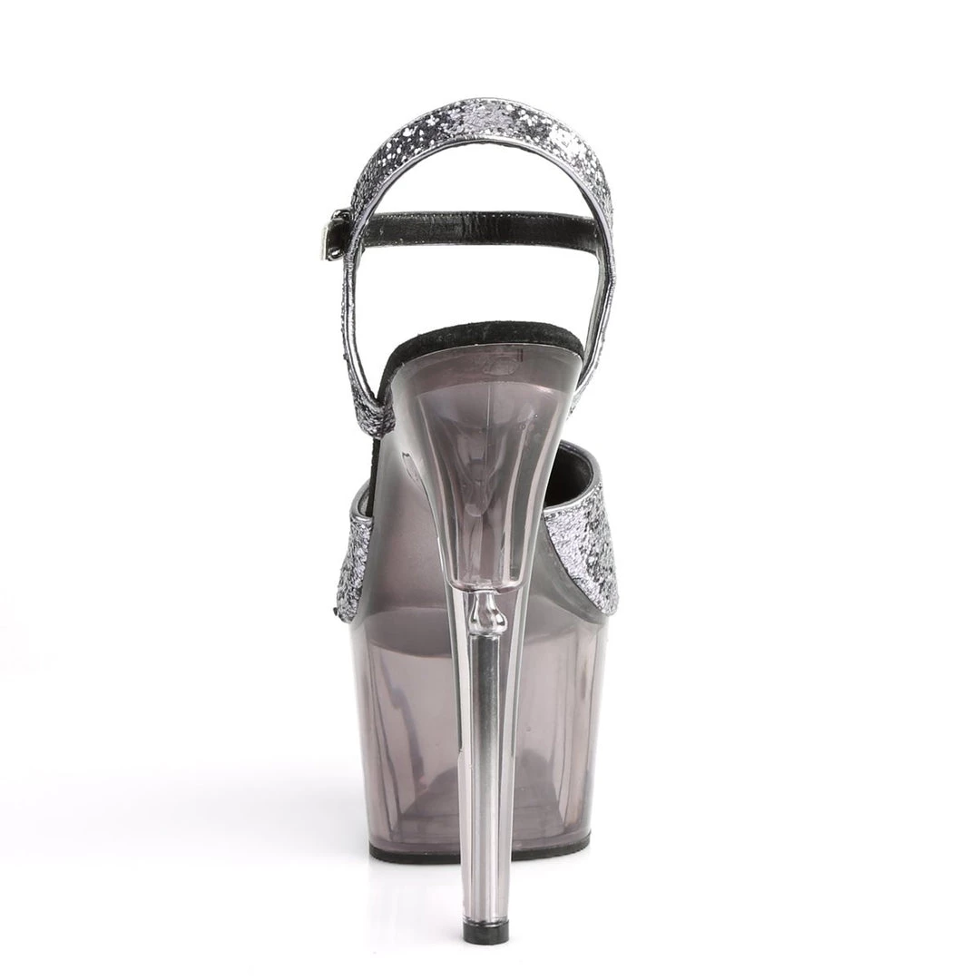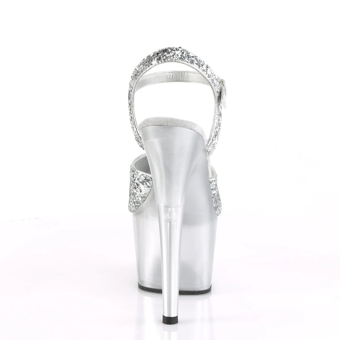 Gorgeous 7″(17.8cm) heel, 2 3/4″(7cm) tinted platform ankle strap sandal. You will attract all the right attention with these glittery sandals.