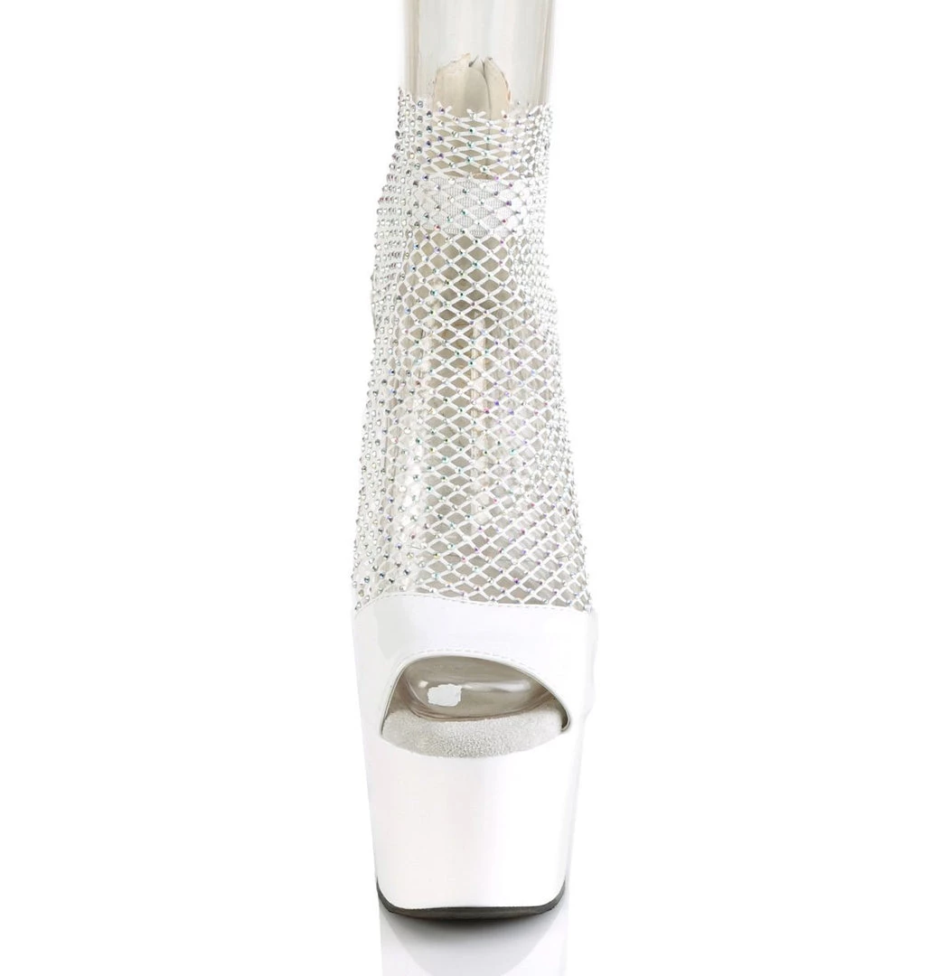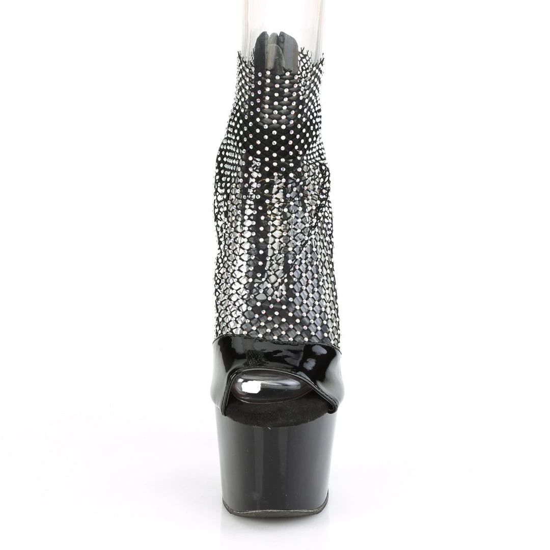 Sleek & sexy 7″ (178mm) heel, 2 3/4″ (70mm) platform close back rhinestone mesh shootie sandal with elastic ankle band and back zip closure.