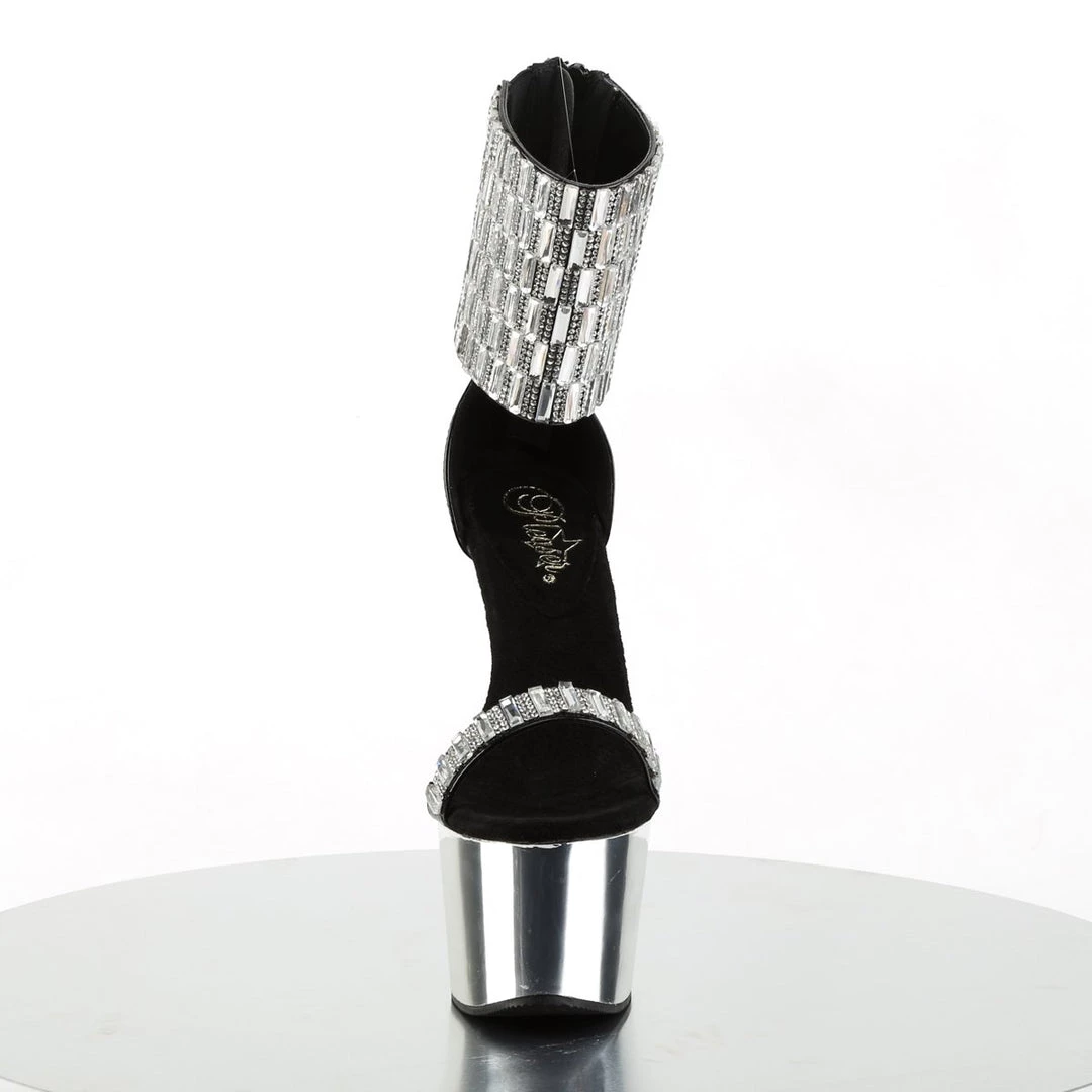 7″(17.75cm) Heel, 2 3/4″(7cm) Chrome Plated Platform Closed Back Sandal Featuring Rhinestone and Mirrors Embellished All Over Wide Ankle Cuff & Toe Strap, Back Zip Closure