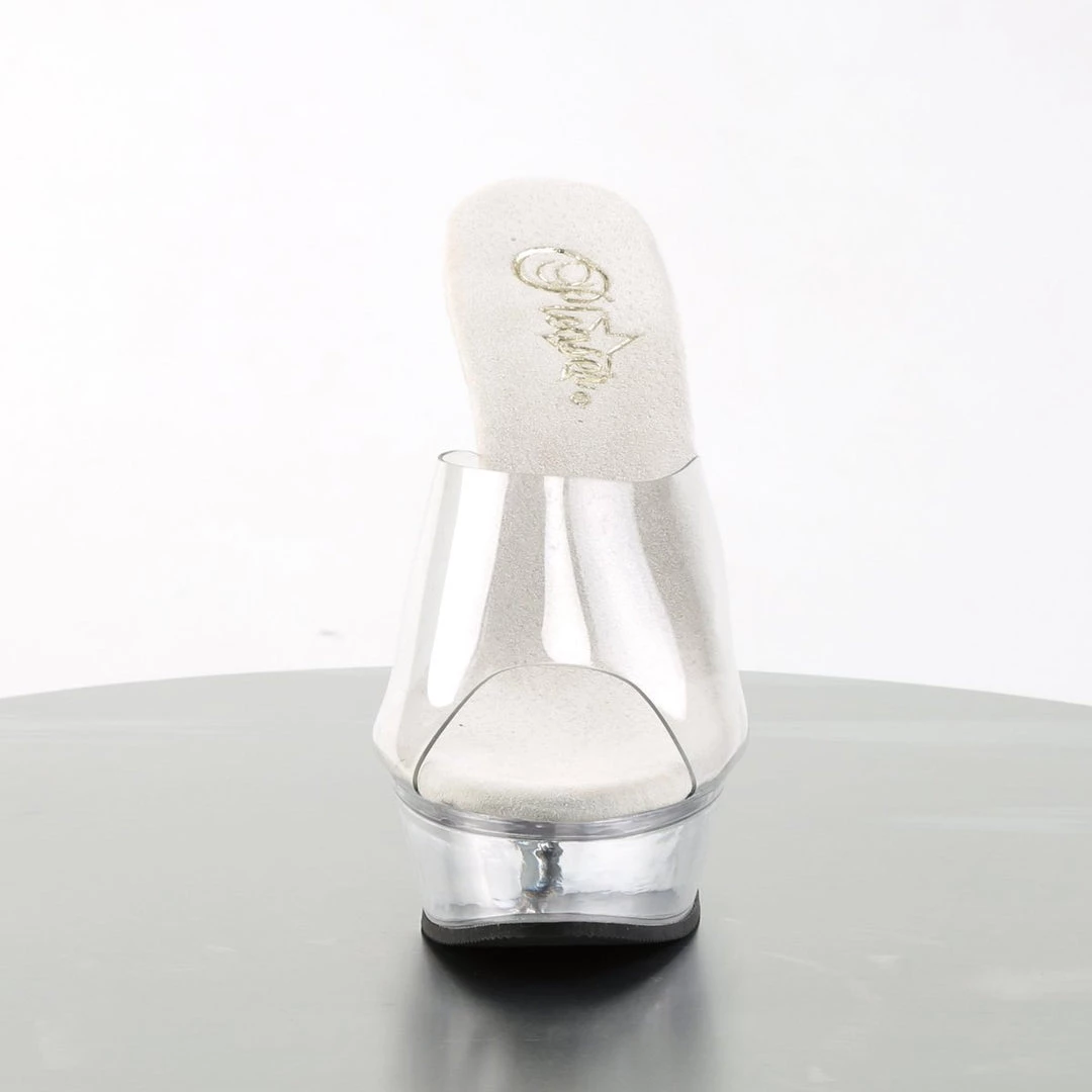 Hot high heel sandals with transparent top crafted in soft plastic and sole with textile cushioning for added comfort. The dazzling 6 inch (15 cm) sculptured metallic heels with rhinestone insertions are balanced by the front platform for a comfortable wear and a sexy look. Dramatic and easy to wear, these sandals can perfectly complement any fetish outfit.