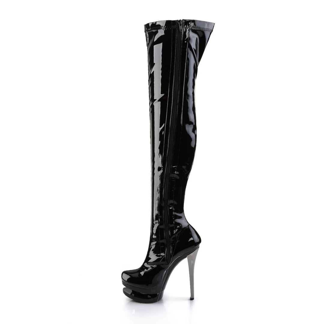 Black patent dual platform lace-up thigh-high boots. Full inner side zipper with 6 inch (15 cm) high stiletto heel with front double platform.