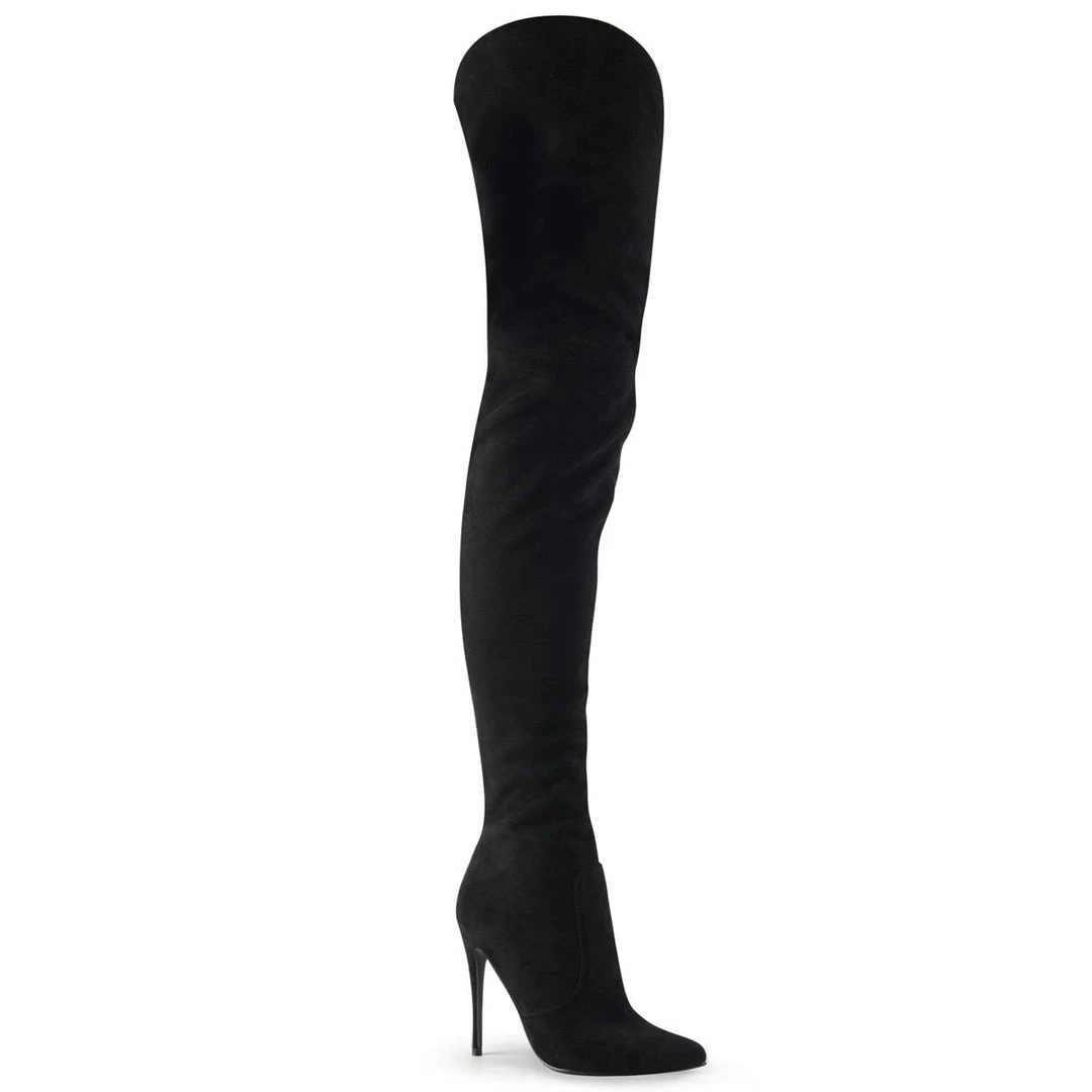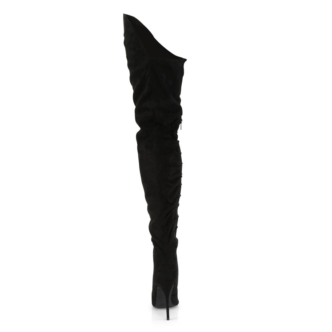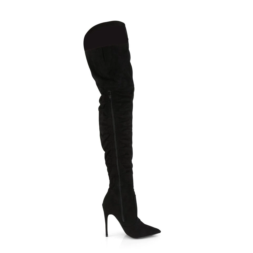 Be the seductress in these 5″ (116mm) heel thigh high boot featuring gathered inner shaft & asymetrical raised outer shaft, 5/6 inside zip closure.