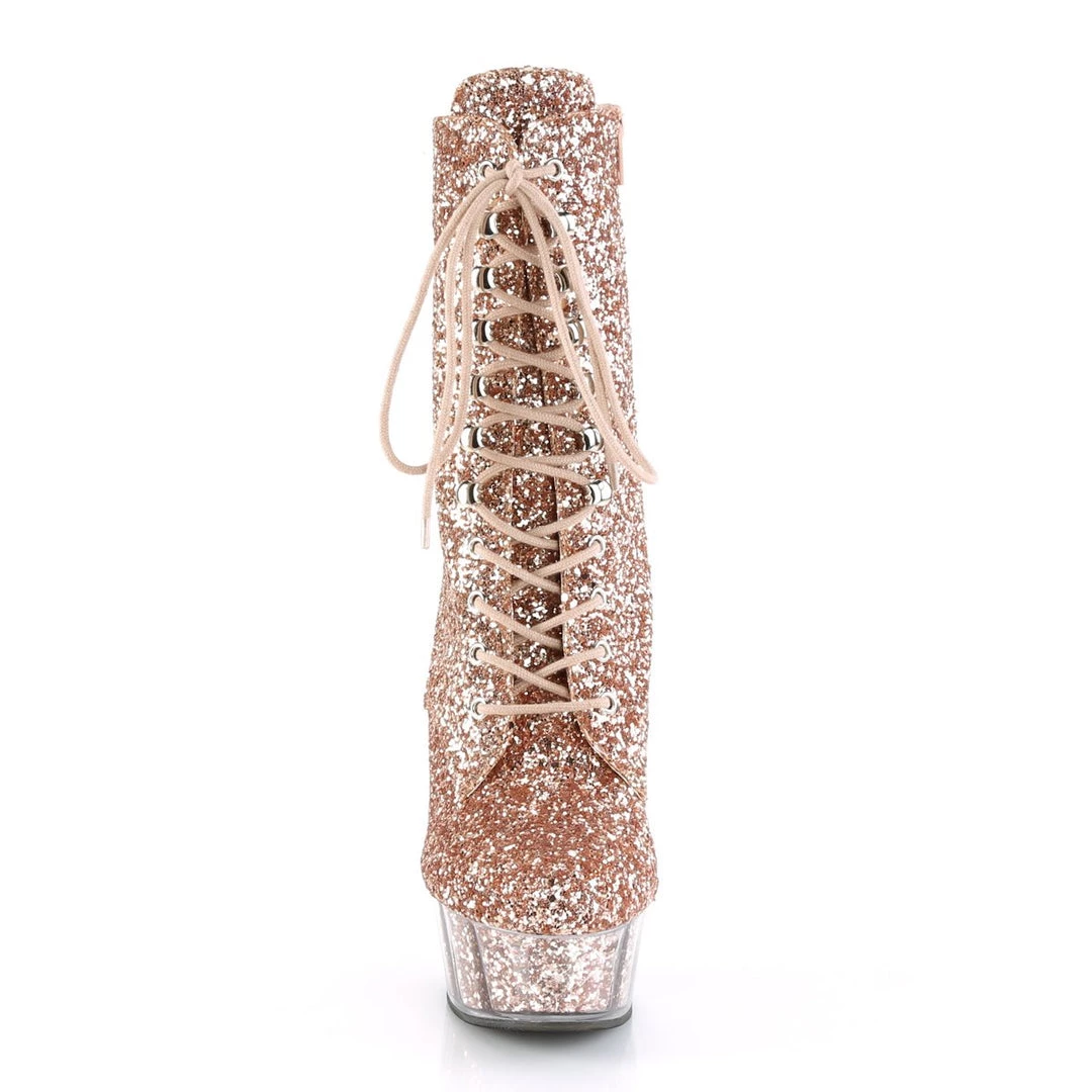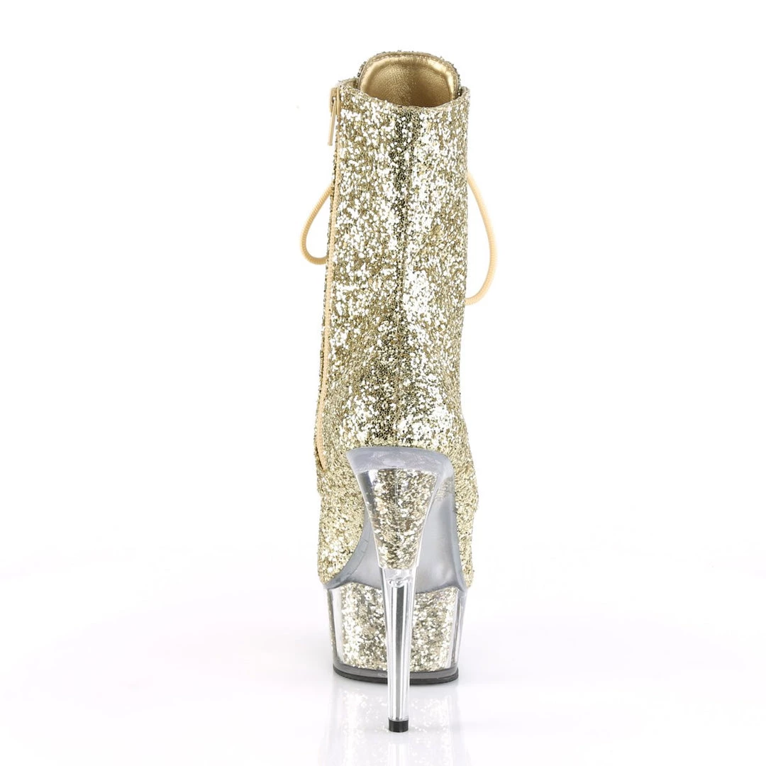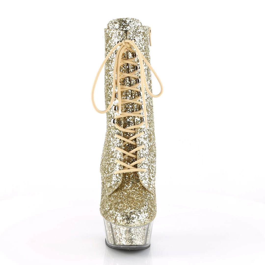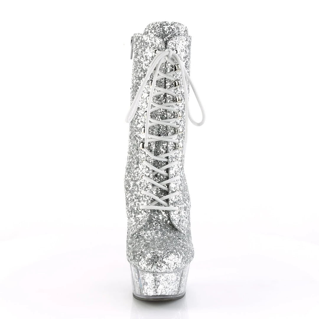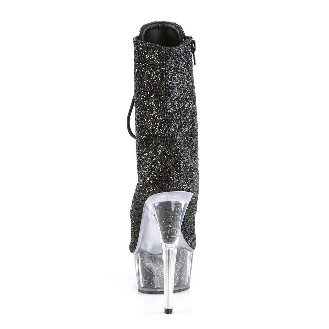 Be at the top of your game in this sparkling 6″ (152mm), 1 3/4″ (45mm) glitter inserted platform lace-up front ankle boots, full inside zip closure.