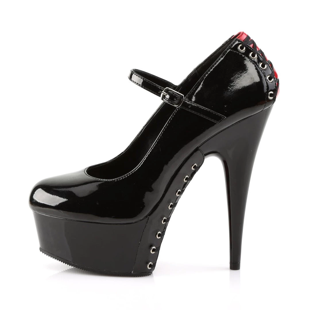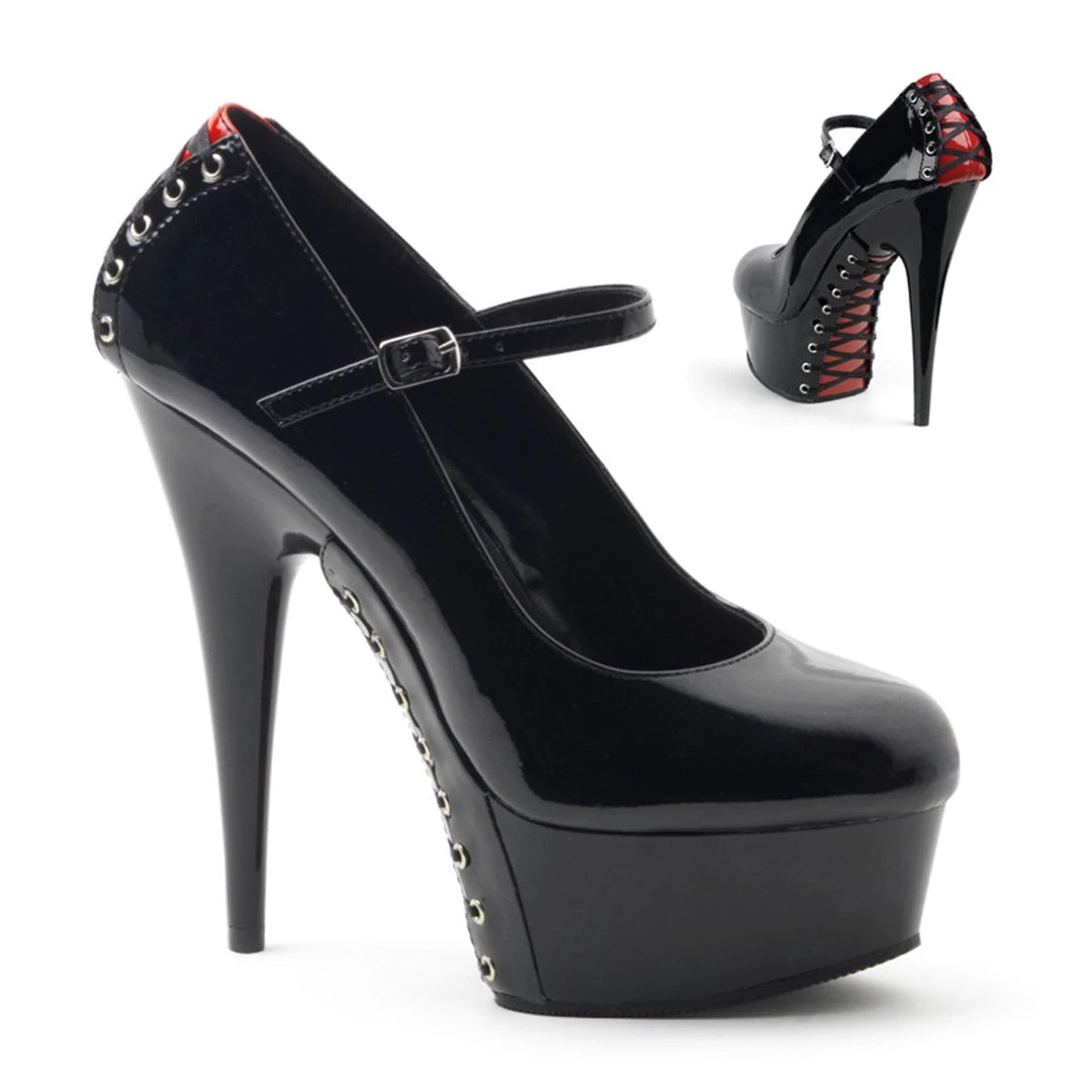 Spice up your look with these reinterpreted Mary Jane black patent shoes. They feature a color insertion in heel area decorated with corset-style lace-up design, 6 inch (15 cm) stiletto heels and a high front platform with matching red insertion embellished with lace-up detail. Comfortable and great looking these shoes remember of cabaret outfits.