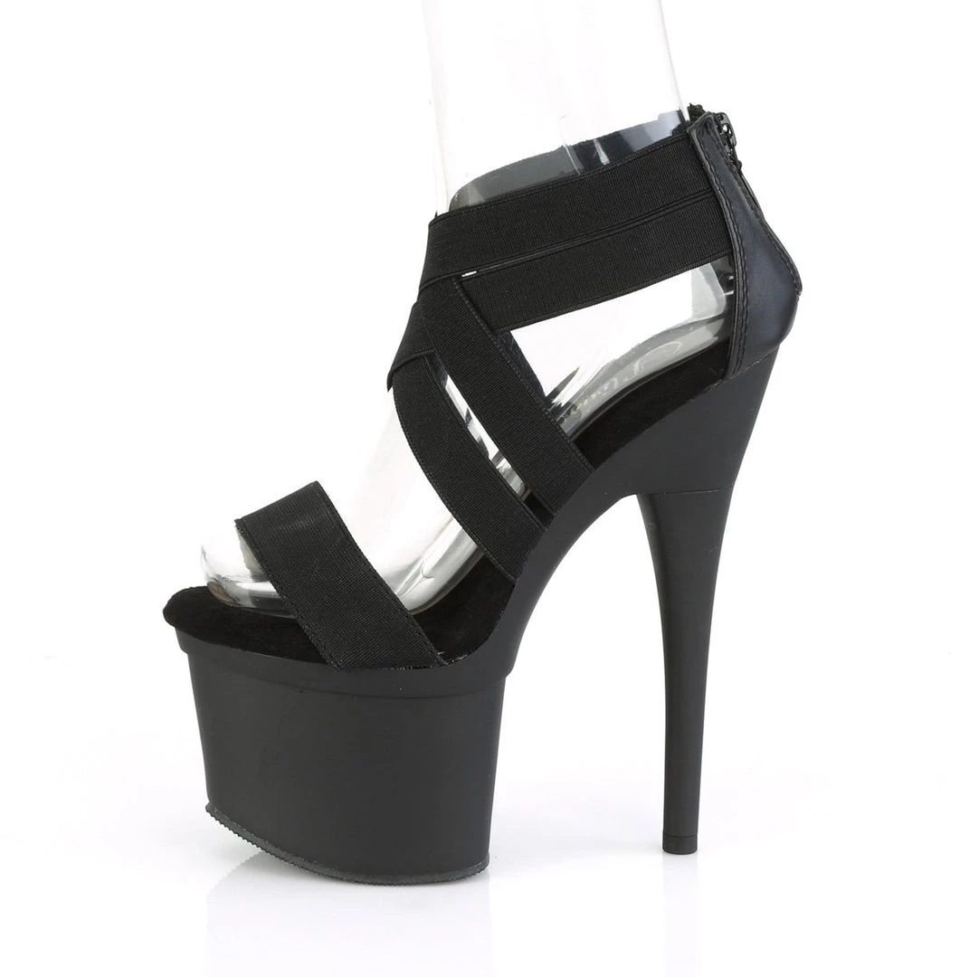 7″ (178mm) heel, 3″ (76mm) platform criss cross sandal with elastic straps and back zip closure.