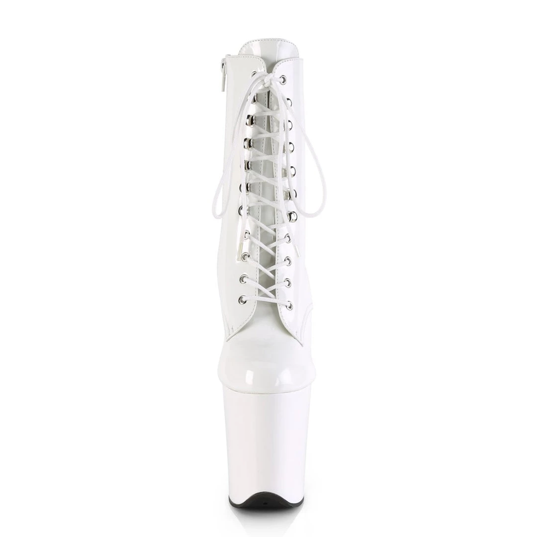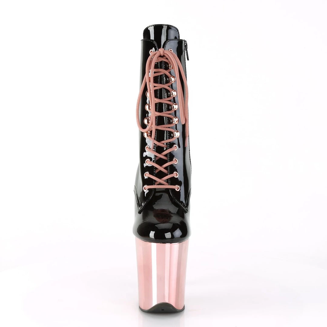Ultra high Front Lace-Up Ankle Boot full inner side zipper with round toe which adds elegance to the design, front lace-up for an adjustable fit and 8″(20.25cm) high stiletto heels which lift the foot and sculpt the leg for a stunning appearance. The front part is balanced by a matching 4″(10.25cm) platform for added comfort and stability.
