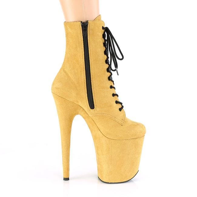 Sleek & sexy 8″ (200mm) heel, 4″ (100mm) platform lace-up front ankle boot featuring fully wrapped platform bottom, inside zip closure.