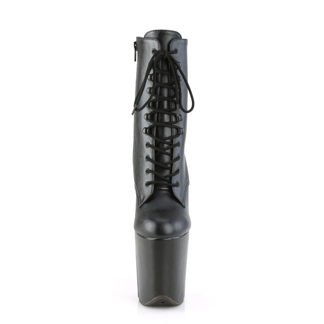 Sleek and polished looking style 8″ (200mm) heel, 4″ (100mm) platform lace-up front ankle boot featuring fully wrapped platform bottom with inside zip closure.