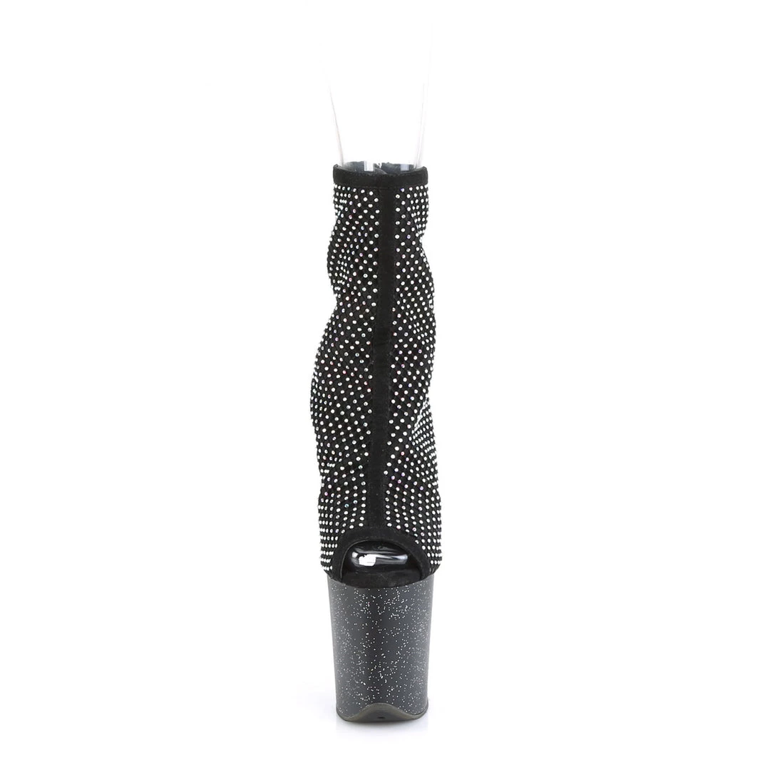Shine like no one is watching! A gorgeous 8″ (200mm) heel, 4″ (100mm) platform peep-toe ankle boot featuring faux suede upper w/AB rhinestone mesh fabric overlay & mini iridescent glitters on the entire platform, back zip closure.