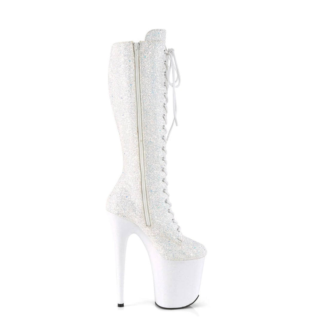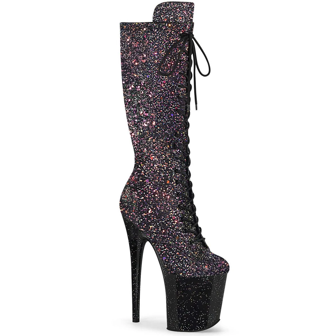 Sparkly & gorgeous 8″ (200mm) heel, 4″ (100mm) platform lace-up front knee high boots featuring mini iridescent glitters on the entire platform bottom with full-length inside zip closure.
