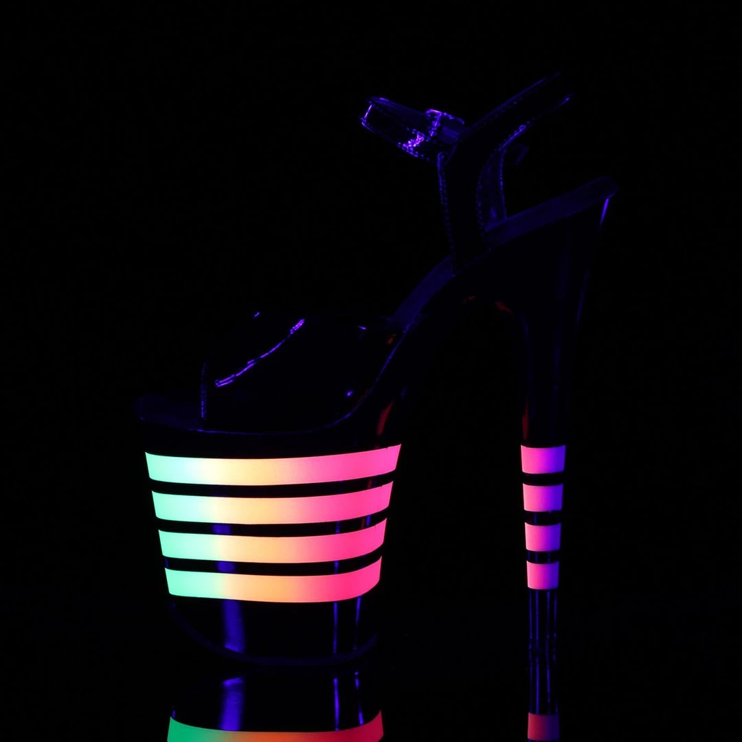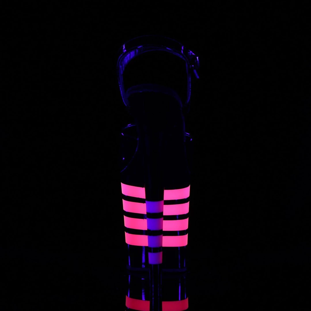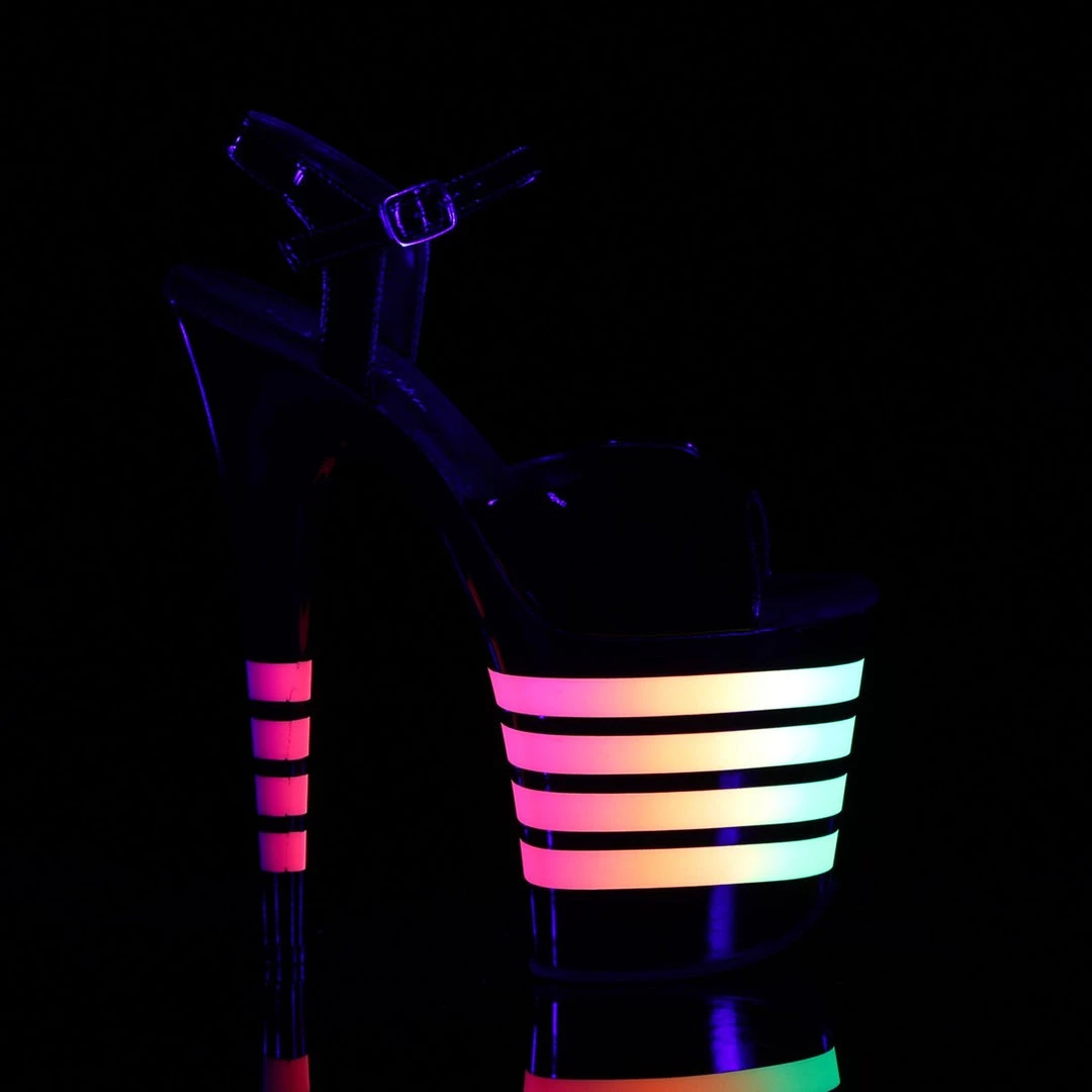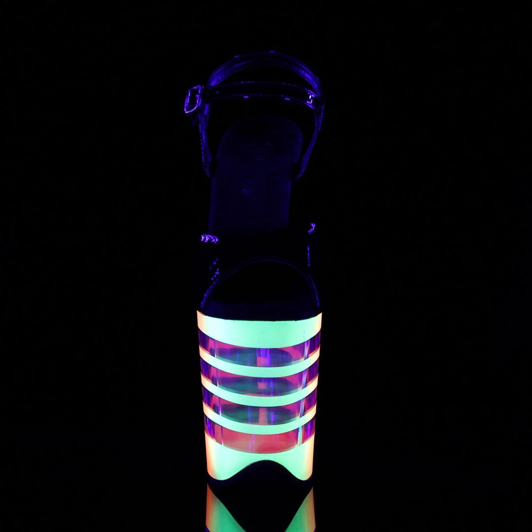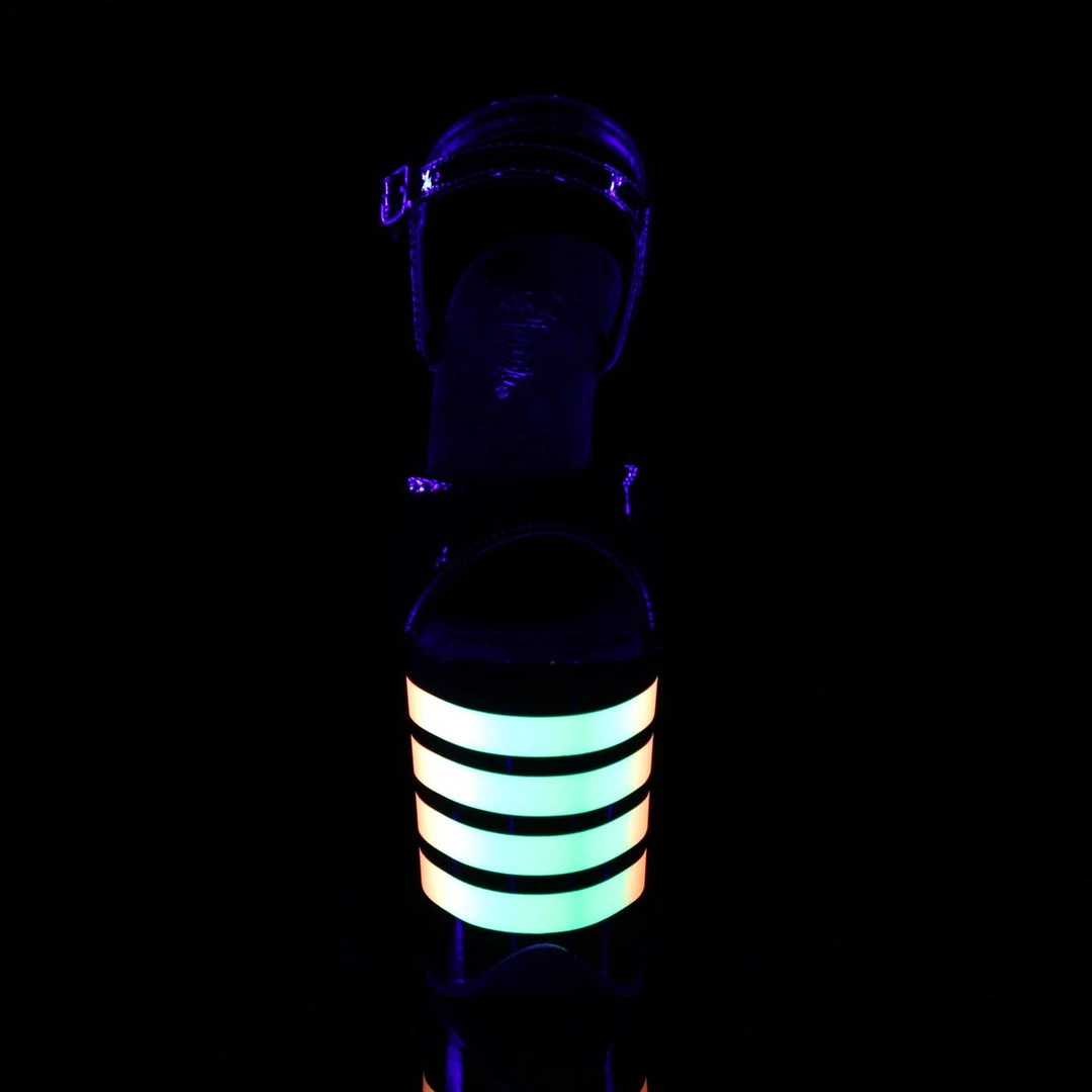 Sexy fetish sandals with top wide strap and thin side straps which support a delicate ankle strap with side closure. The dramatic 8 inch (20 cm) high heels are the centre of attention in these super sexy sandals, while the front 4″ platform and neon UV Reactive lines completes the look and adds further stability and comfort for the feet.