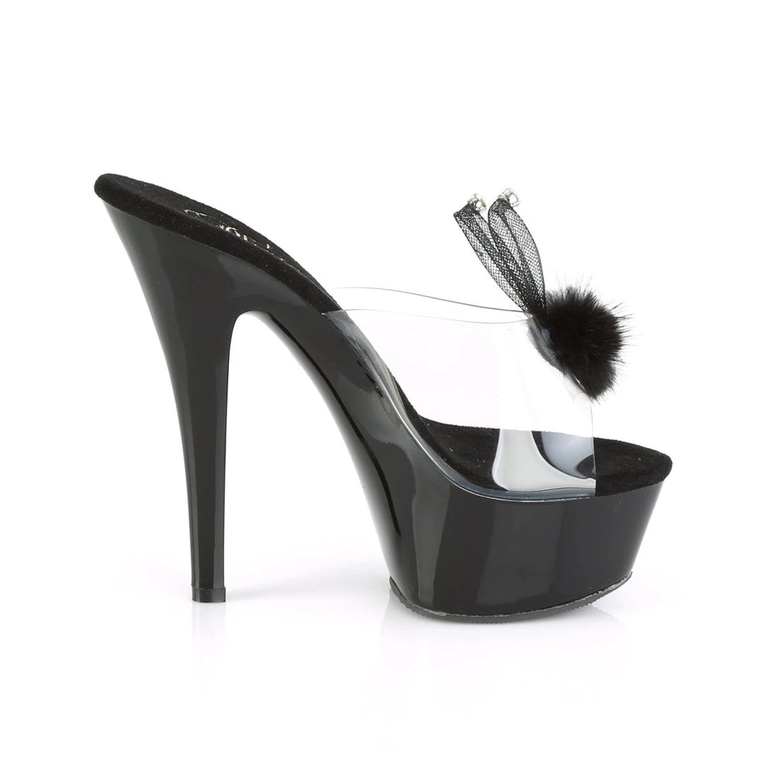 Sexy and whimsical 6″ (152mm) heel, 1 3/4″ (45mm) platform slide featuring rhinestone adorned bunny ear on vamp.