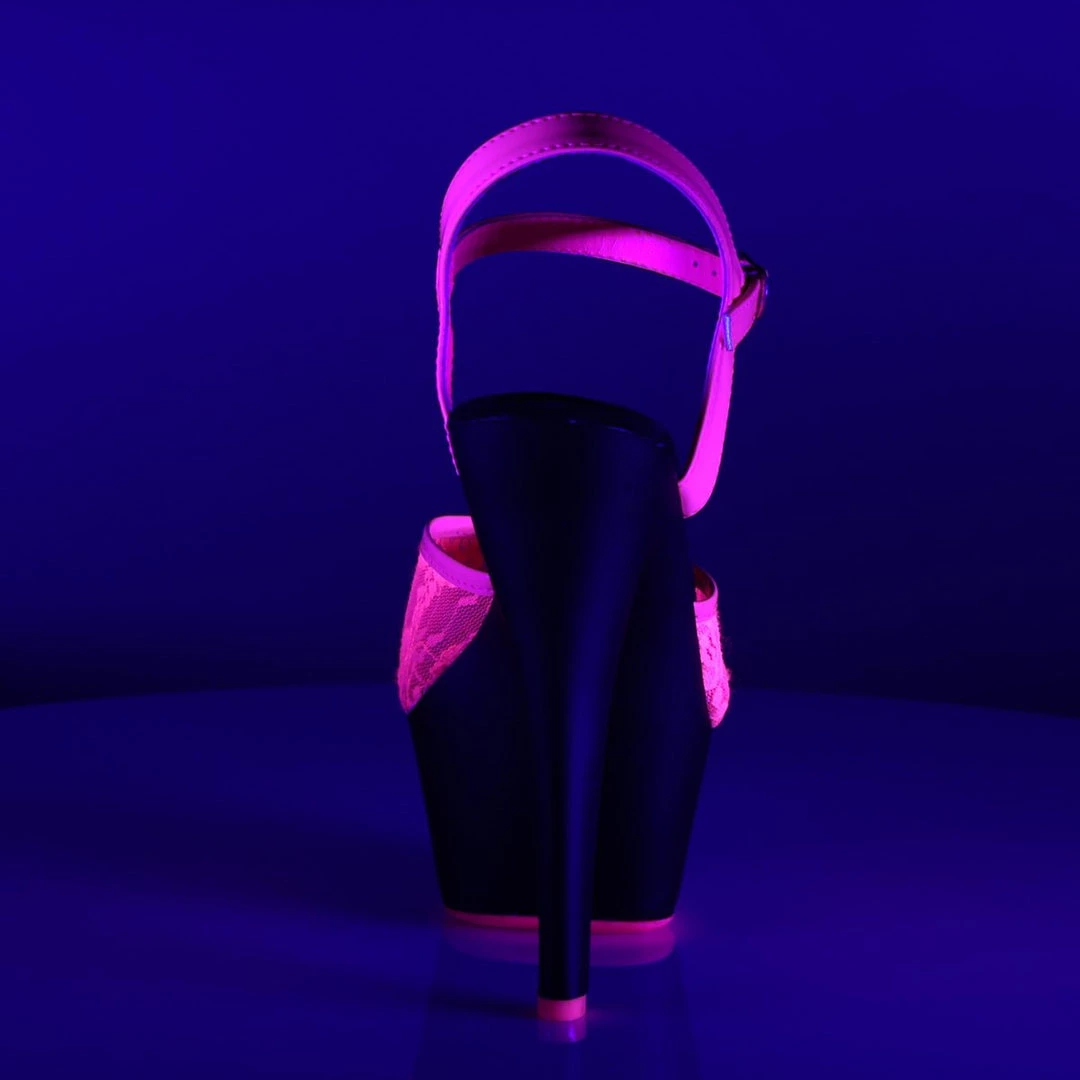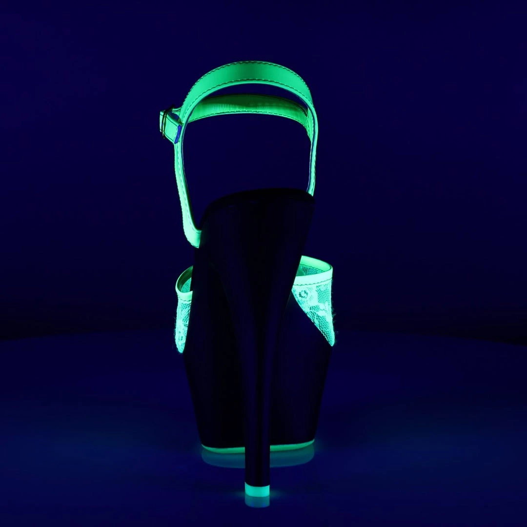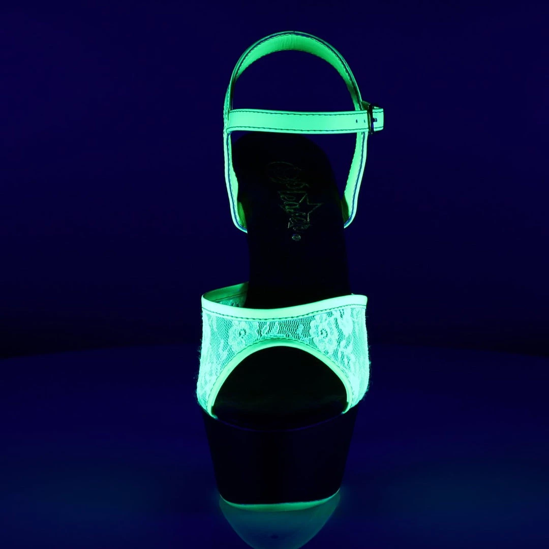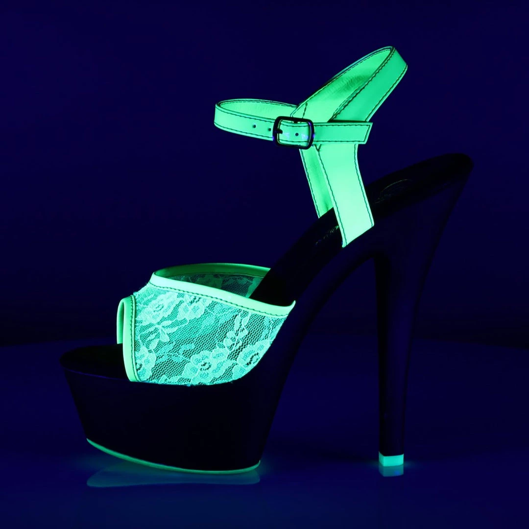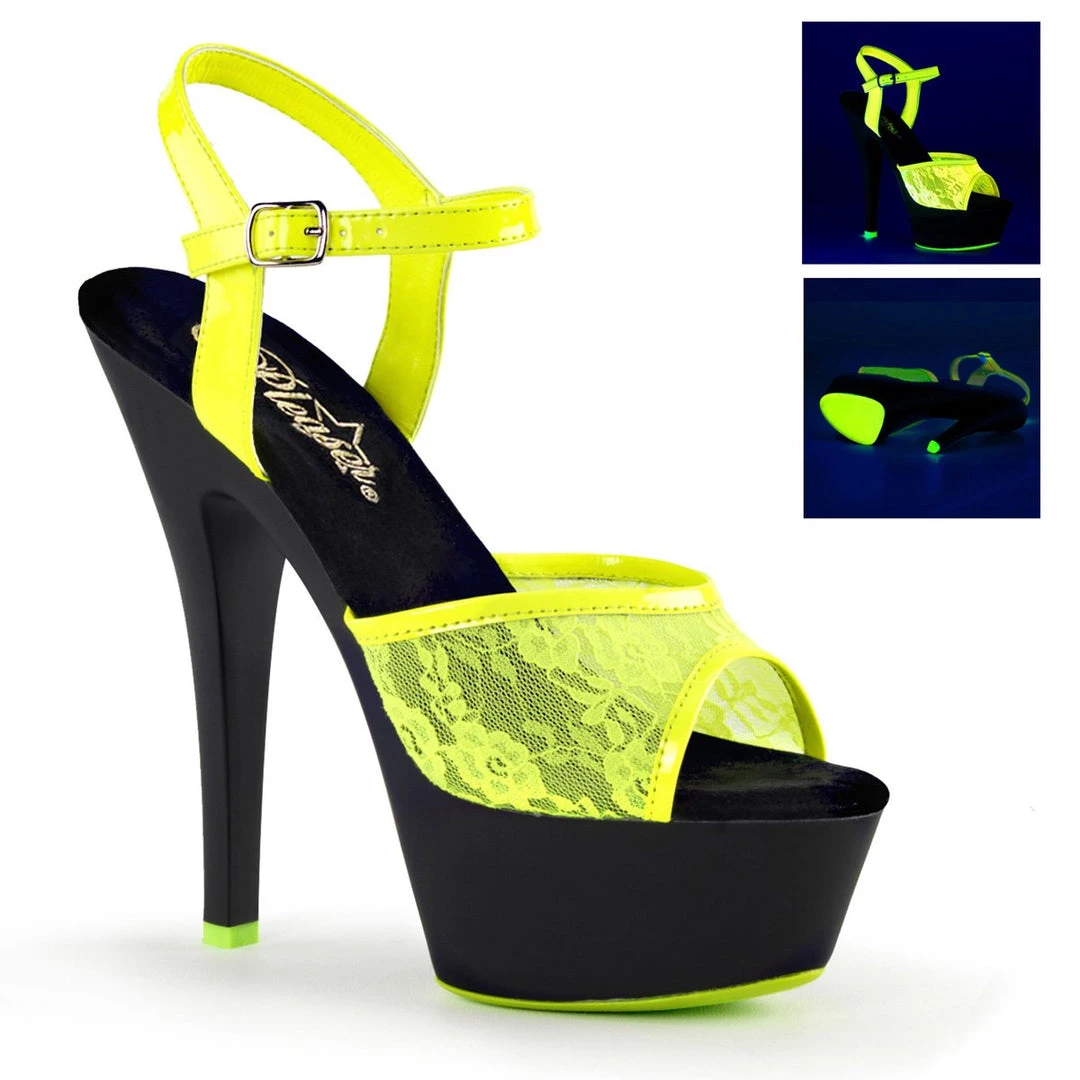 Stylish Platform Lace Appliqued Mesh Ankle Strap Sandal Featuring Entire Upper and Outsole/Toplift UV Blacklight Reactive with peep-toe detail, toe strap with wide base and thin middle and side straps which support a chic ankle strap with discreet side closure with metallic buckle. This classic look is lifted onto a dazzling high 6 inch (15 cm) stiletto heel balanced by a high front 1 3/4″(4.5cm) platform for added stability.
