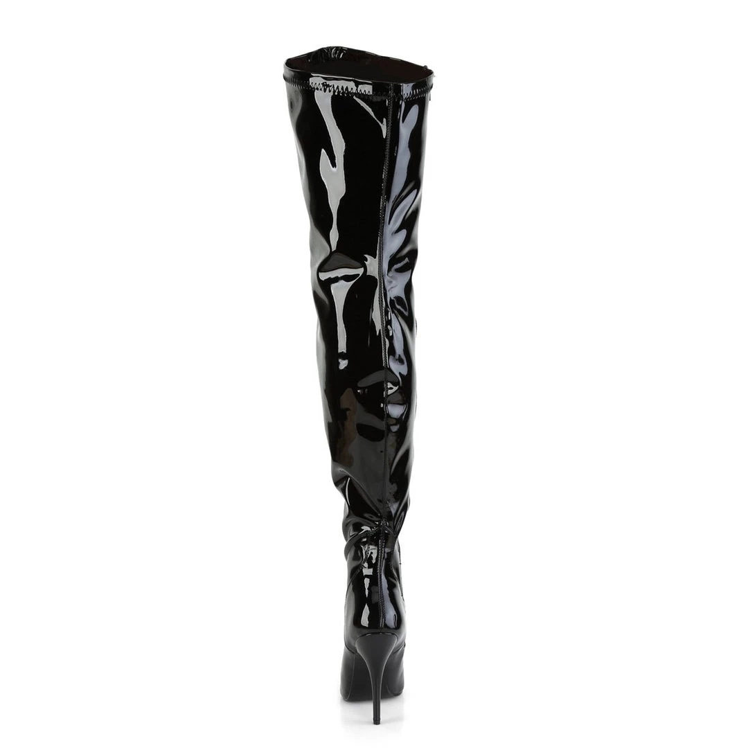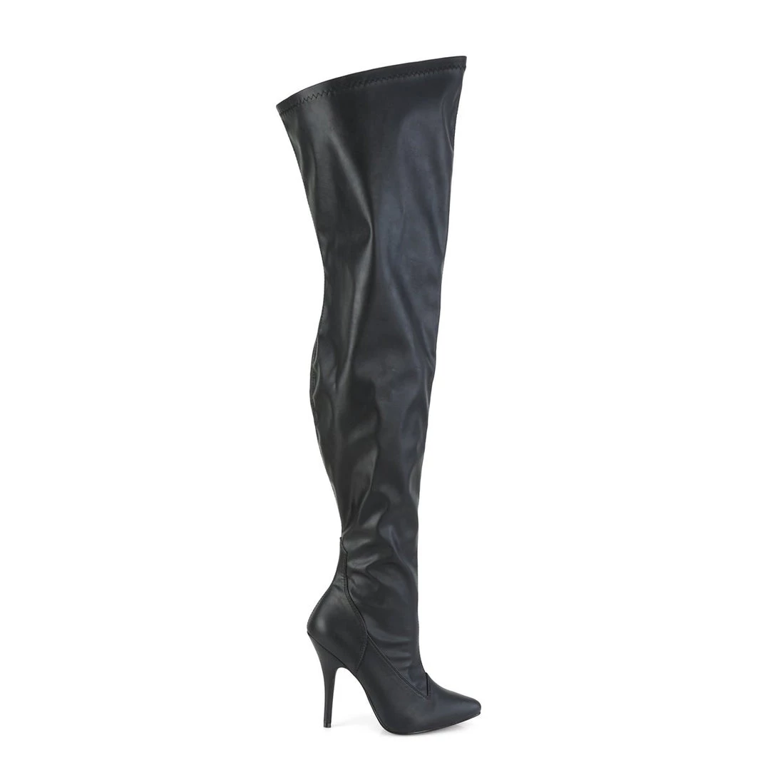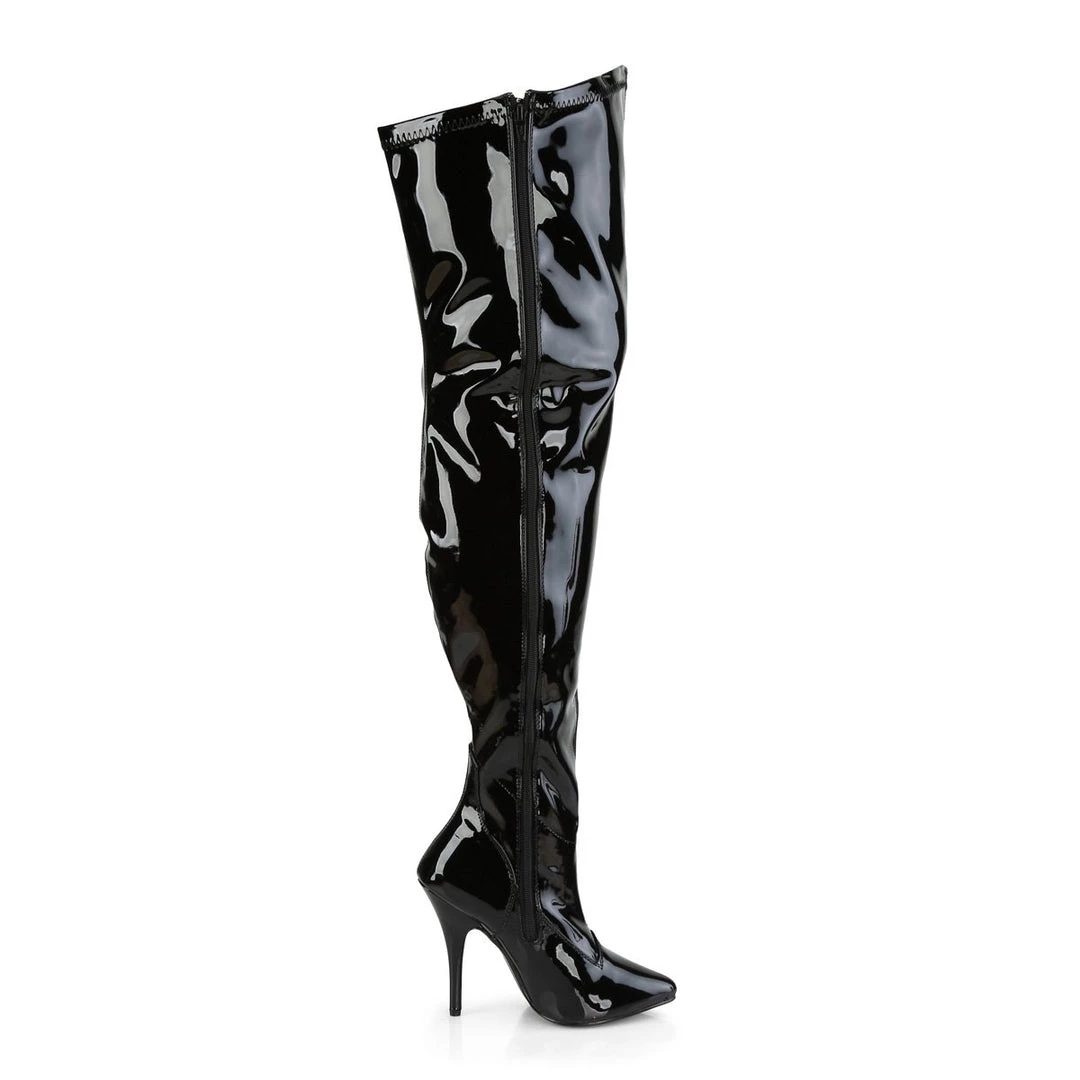 Sexy as hell! 5″ (127mm) heel wide calf stretch thigh high boot with inside zip closure for easy wearability.